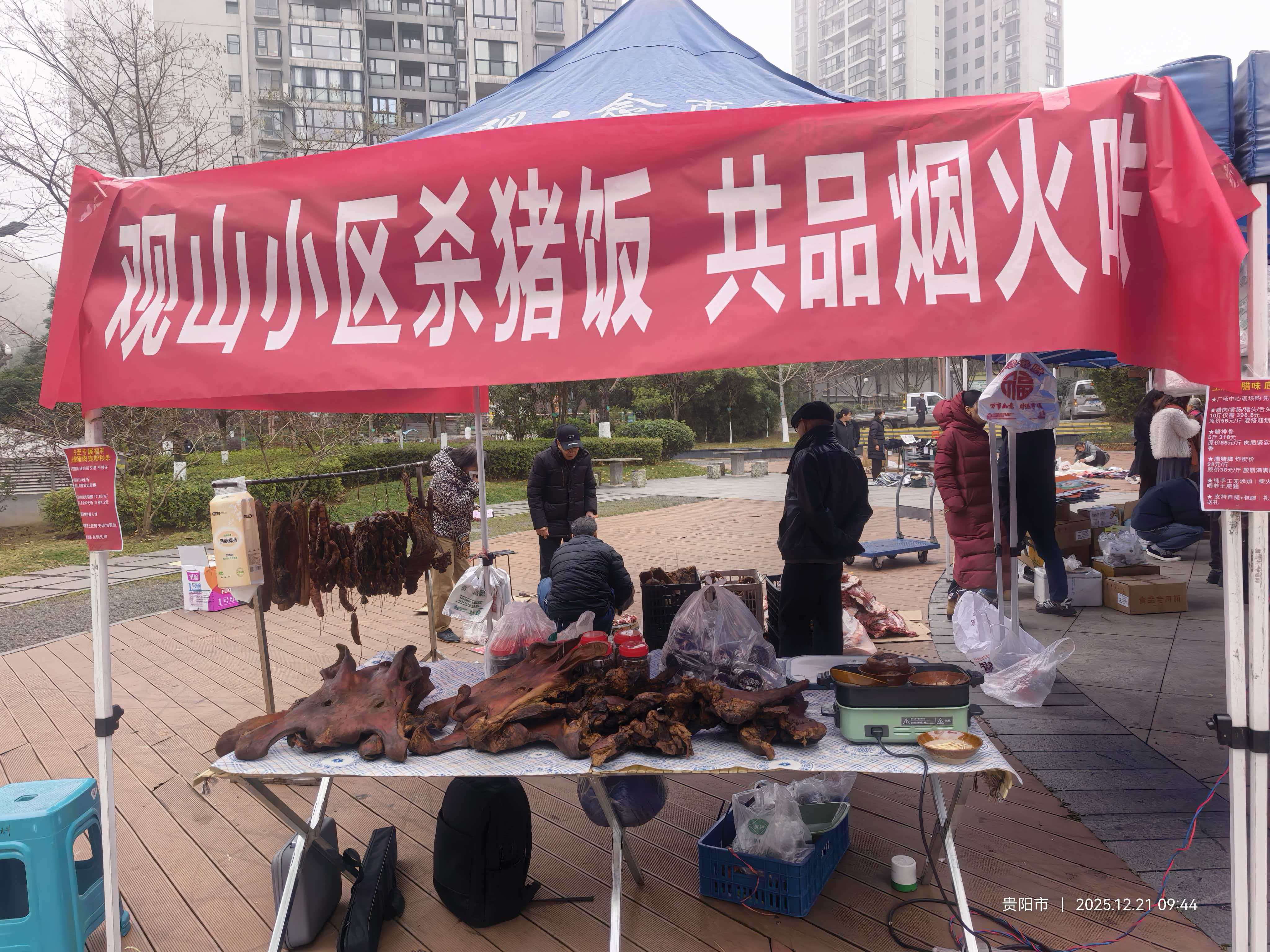 农历冬月初二,贵阳市观山小区的中心广场一改往日的宁静,久违的炊烟与欢声在此升腾。12月21日中午,一场以“观念市集”为理念、旨在重现旧日街坊温情的“杀猪饭”盛宴在此热闹举行,吸引了约五百名业主及家人参与。