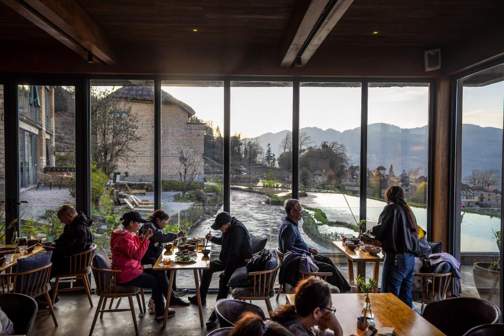 2月27日,在云南省元阳县阿者科村,游客在村民开的民宿餐厅吃晚餐。新华社记者 胡超 摄