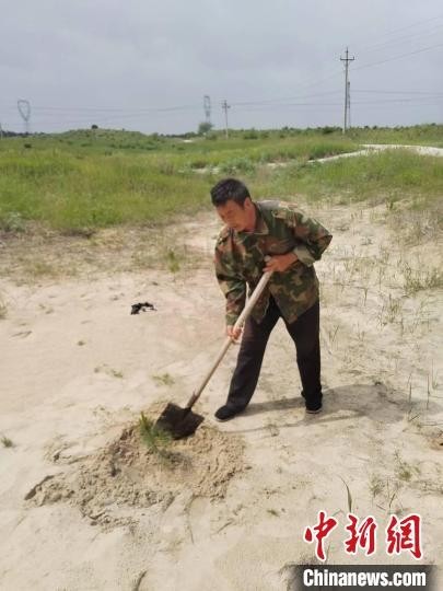 护林员李东魁在彰武县章古台林场种植樟子松。(受访者供图)