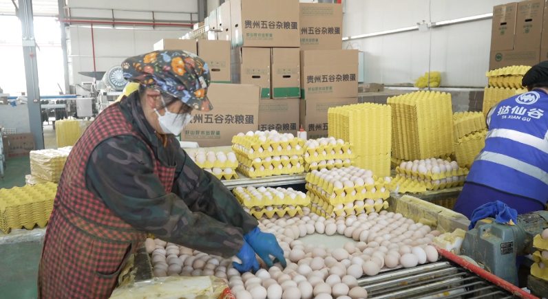 在万山区鱼塘乡蛋鸡养殖基地,自动化设备实现智能喂养和分拣。每箱鸡蛋都贴有专属“身份证”,扫码可查养殖信息。