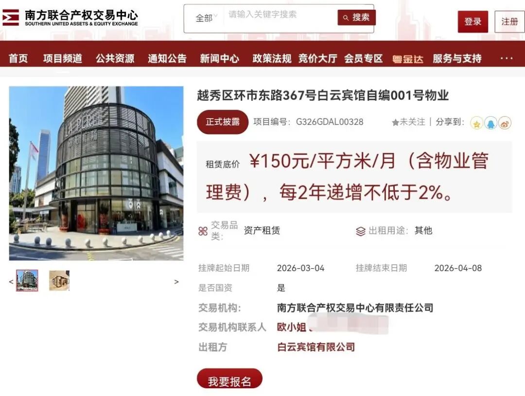 近日,南都N视频记者从南方联合产权交易中心了解到,白云宾馆正在出租越秀区环市东路367号白云宾馆自编001号物业。该物业为整体商城,现由丽柏广场运营,地处环市东商圈,紧邻白云宾馆、友谊商店、世贸中心等。