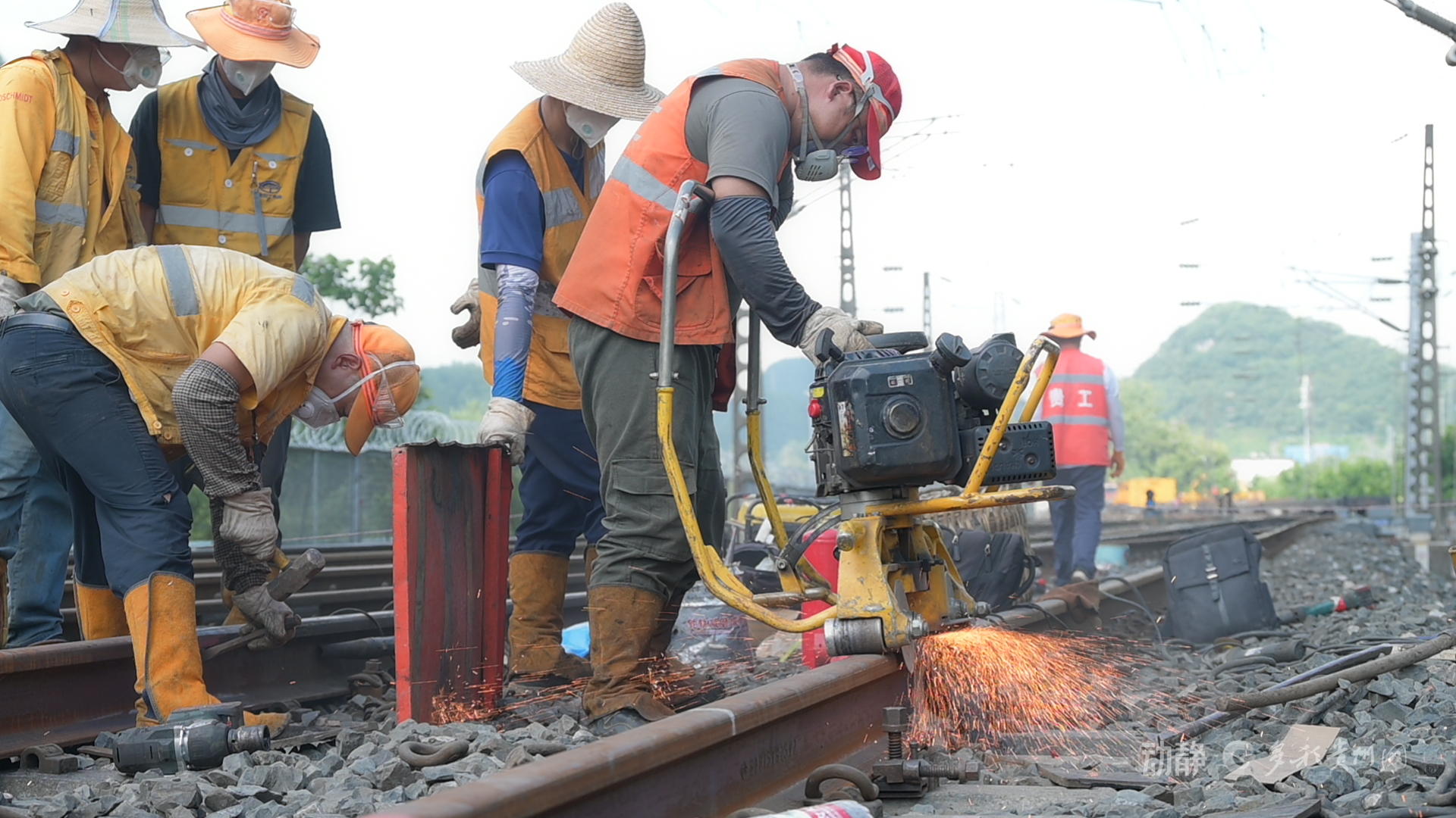 为高效完成此次大修集中修任务,国铁成都局统筹组织贵阳工务段、六盘水工电段、凯里工务段、贵阳电务段等160余支队伍、11000余名工作人员,计划完成更换钢轨约133公里、道床清筛约107公里、更换道岔140余组、大修换枕40000根、道岔清筛60余组。其中,成都工务大修段需在9小时天窗期内完成贵阳南站岔群改造,折合7组单开道岔工作量,创近年技术难度之最。