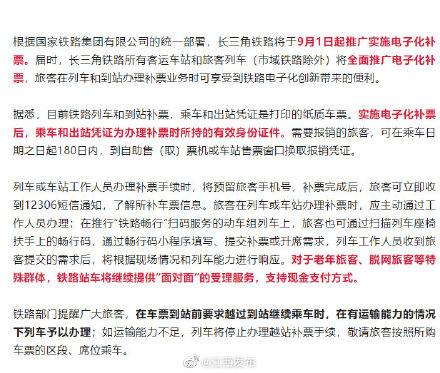 ▲9月1日起,长三角铁路所有客运车站和旅客列车(市域铁路除外)将全面推广电子化补票。老年旅客、脱网旅客等特殊群体,铁路站车将继续提供“面对面”受理服务。
