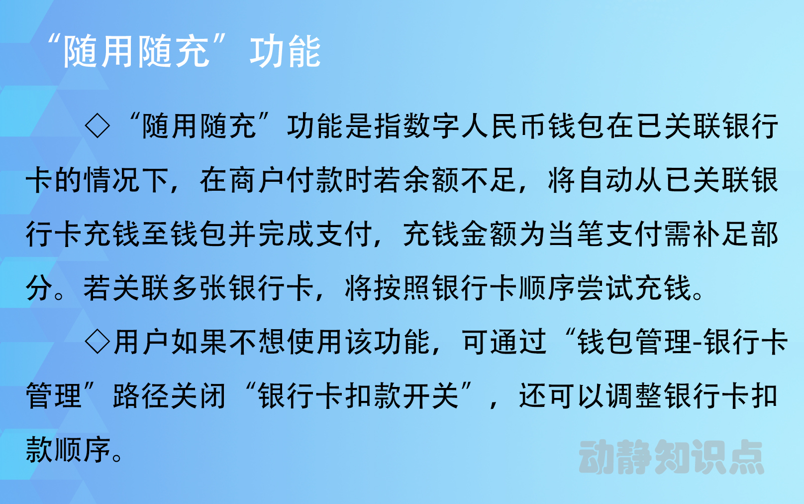 ▲近日,数字人民币App推出新的支付功能——“随用随充”功能。钱包添加银行卡,随用随充更便捷,既能在用户钱包余额不足时“无感”补足余额、提升用户支付便利,又能避免日常资金沉淀在钱包里,让用户得以享受银行账户利息。
