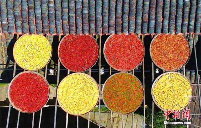资料图:航拍下的晒架上放着辣椒、玉米等五彩缤纷的丰收成果。刘占昆 摄
