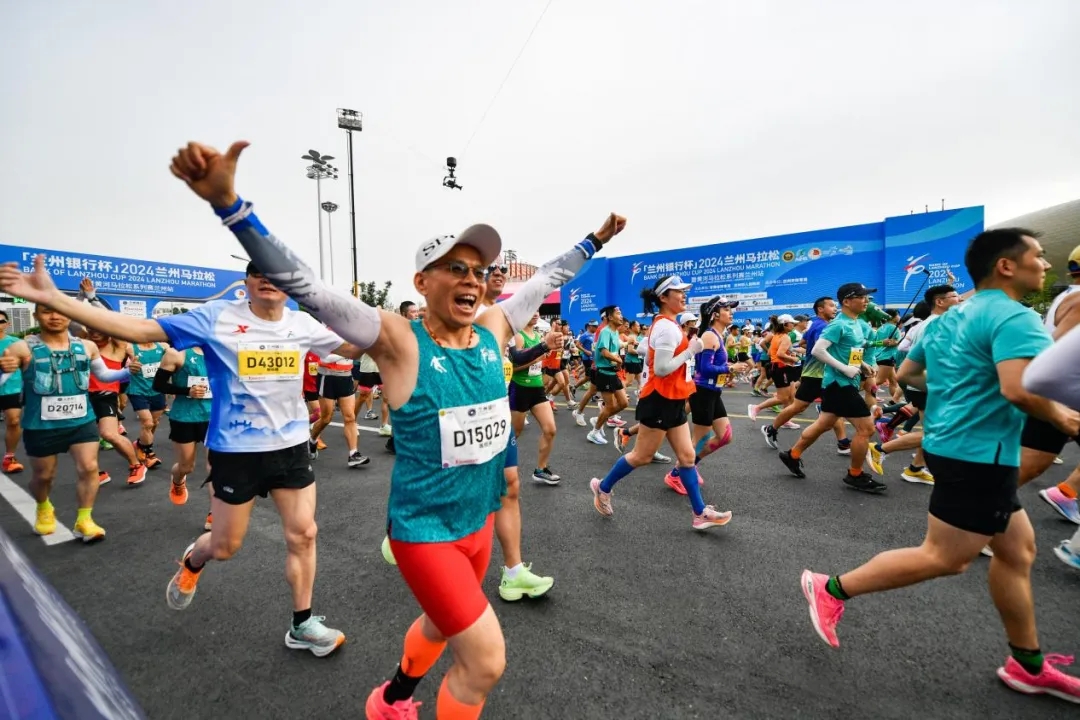 2024年5月26日,2024兰州马拉松在兰州奥体中心鸣枪开跑。图为参赛选手在比赛中出发。新华社记者 郎兵兵 摄