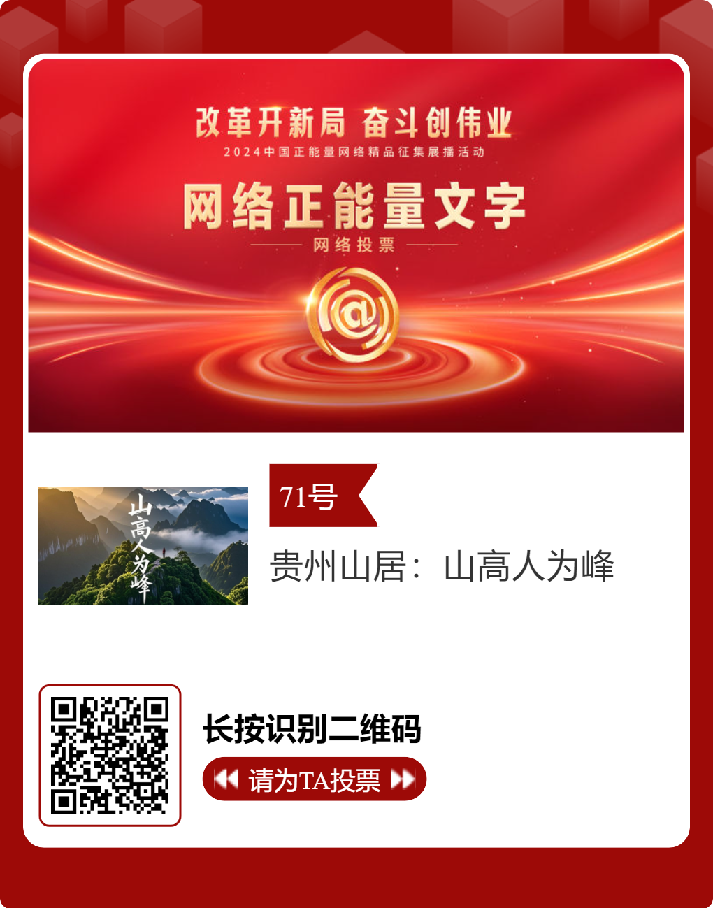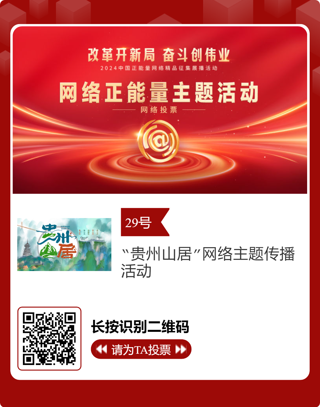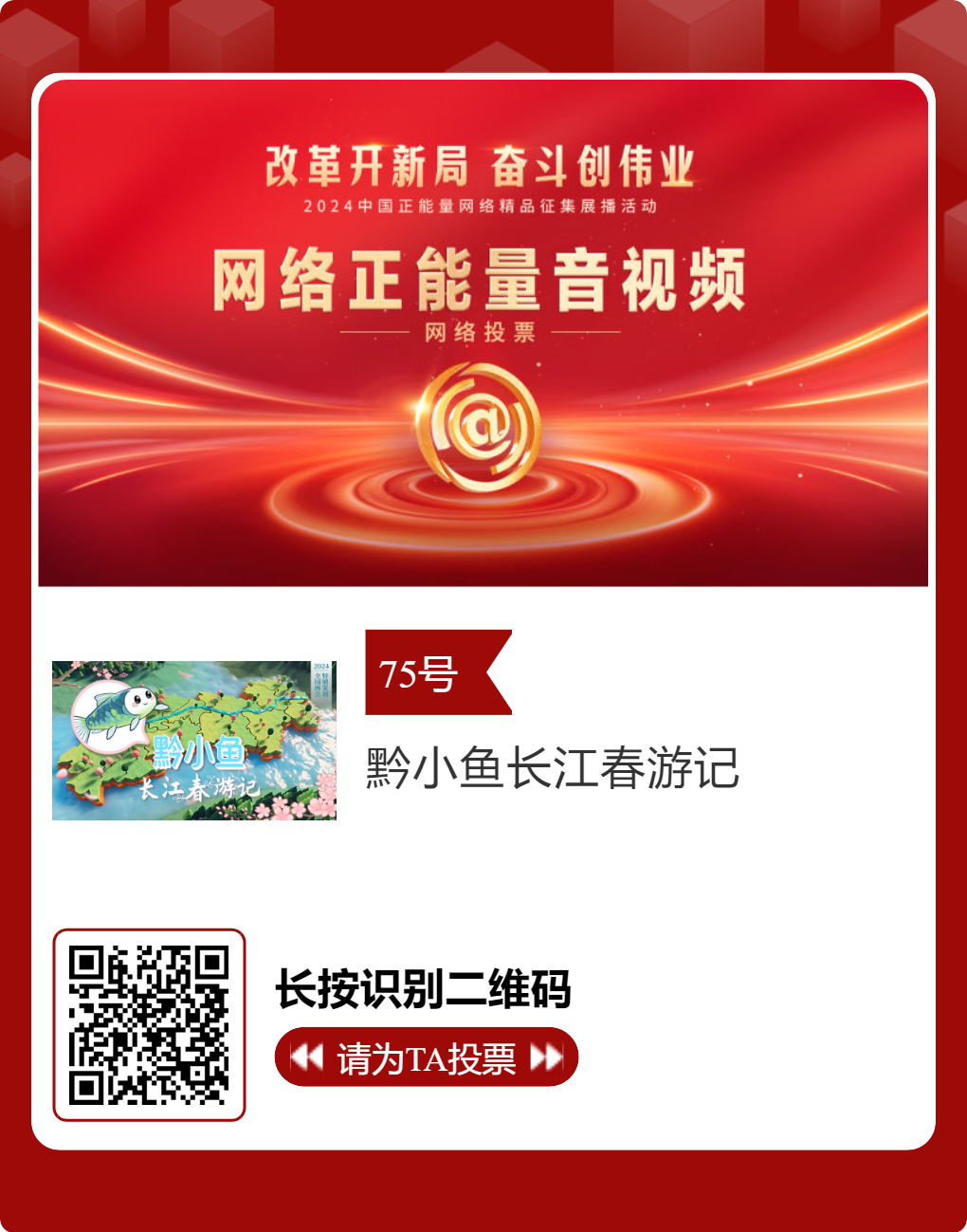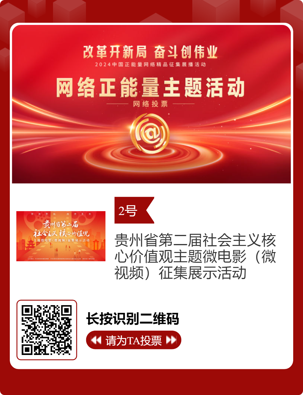 贵州台12件作品入选!2024中国正能量网络精品,等你来投票 “网信中国”微信公众号 | 2025-02-16 14:02 改革开新局,奋斗创伟业。由中央网信办主办的2024中国正能量网络精品征集展播活动今天启动网络展播投票,时间为2月15日至2月21日,投票结果将作为中国正能量网络精品遴选的重要参考。中国正能量网络精品,期待每一个充满正能量的你投出点赞一票。 其中,贵州台12个作品入选。点击下方图片或扫描二维码进行投票↓↓ 记者: 周黔 编辑: 周黔 责编: 李佳 编审: 李铁流