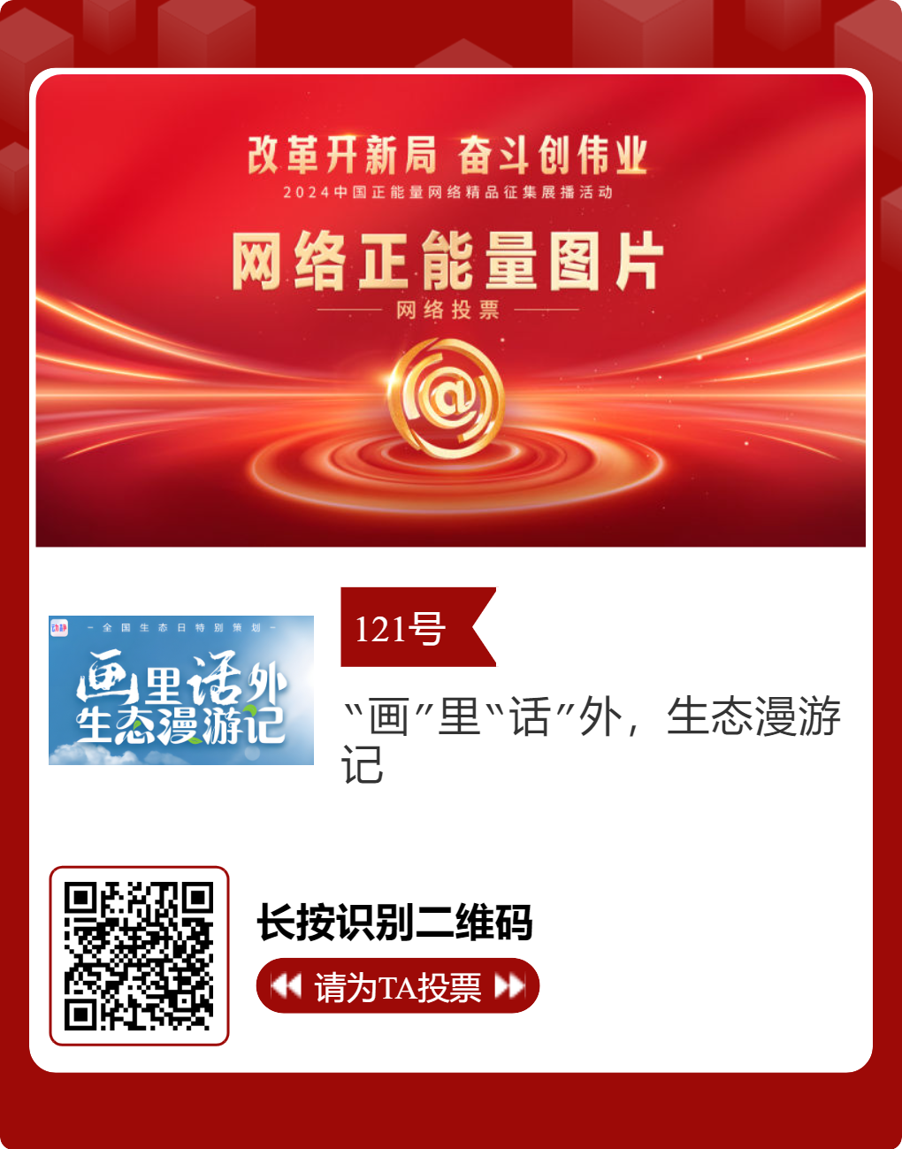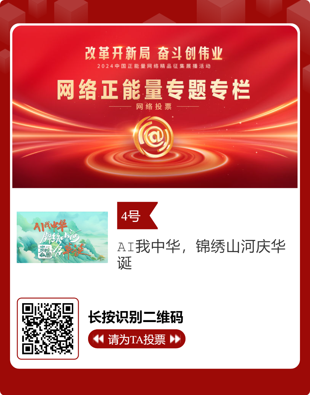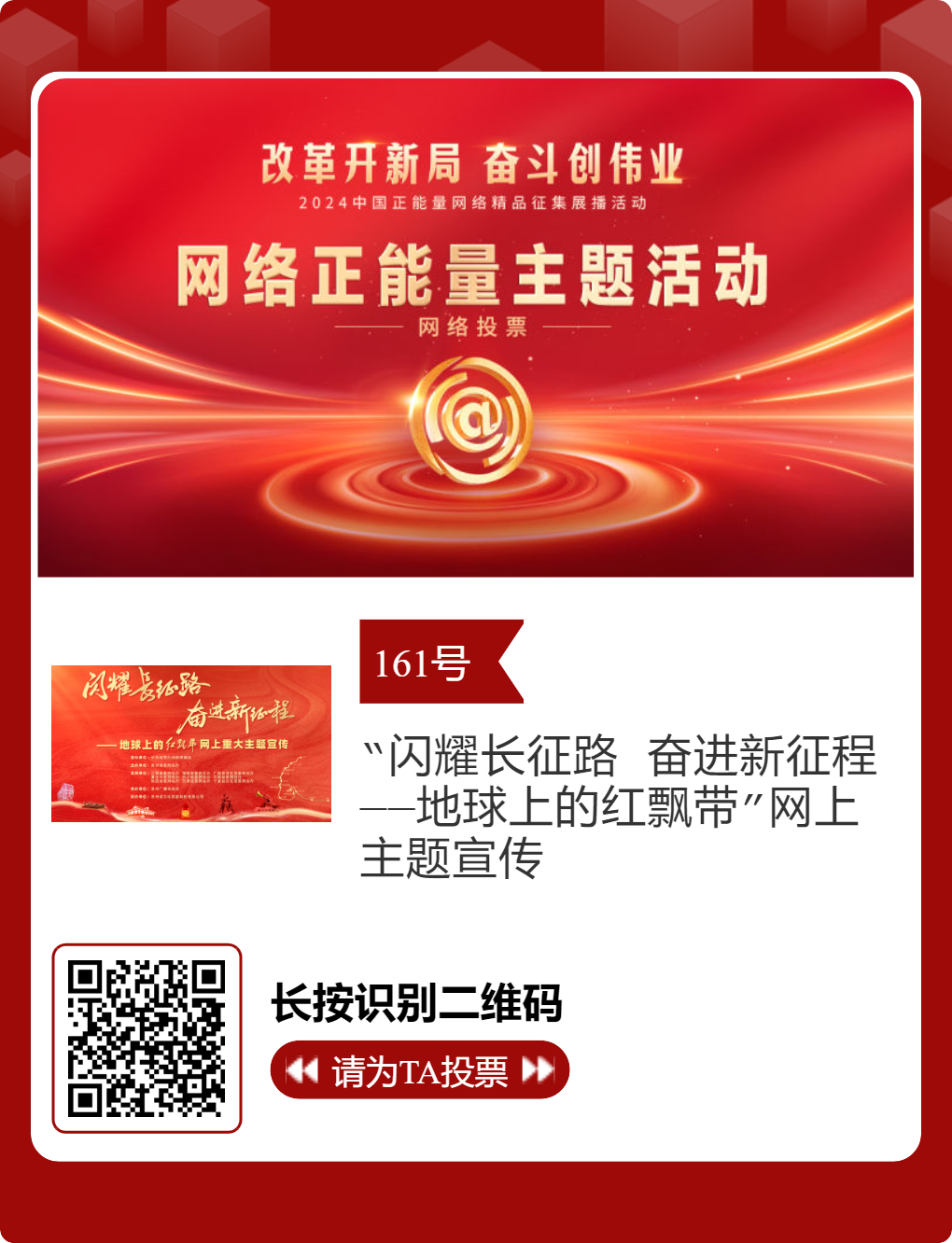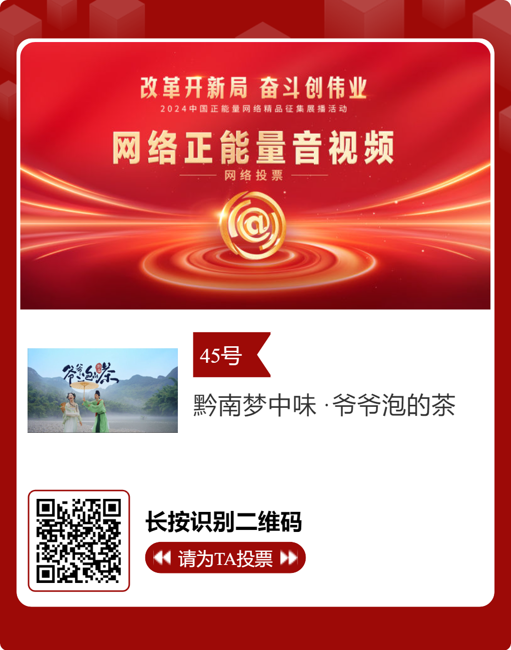 贵州台12件作品入选!2024中国正能量网络精品,等你来投票 “网信中国”微信公众号 | 2025-02-16 14:02 改革开新局,奋斗创伟业。由中央网信办主办的2024中国正能量网络精品征集展播活动今天启动网络展播投票,时间为2月15日至2月21日,投票结果将作为中国正能量网络精品遴选的重要参考。中国正能量网络精品,期待每一个充满正能量的你投出点赞一票。 其中,贵州台12个作品入选。点击下方图片或扫描二维码进行投票↓↓ 记者: 周黔 编辑: 周黔 责编: 李佳 编审: 李铁流
