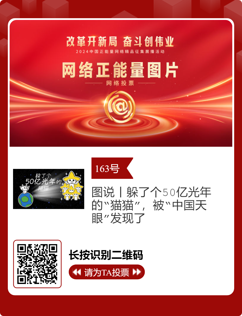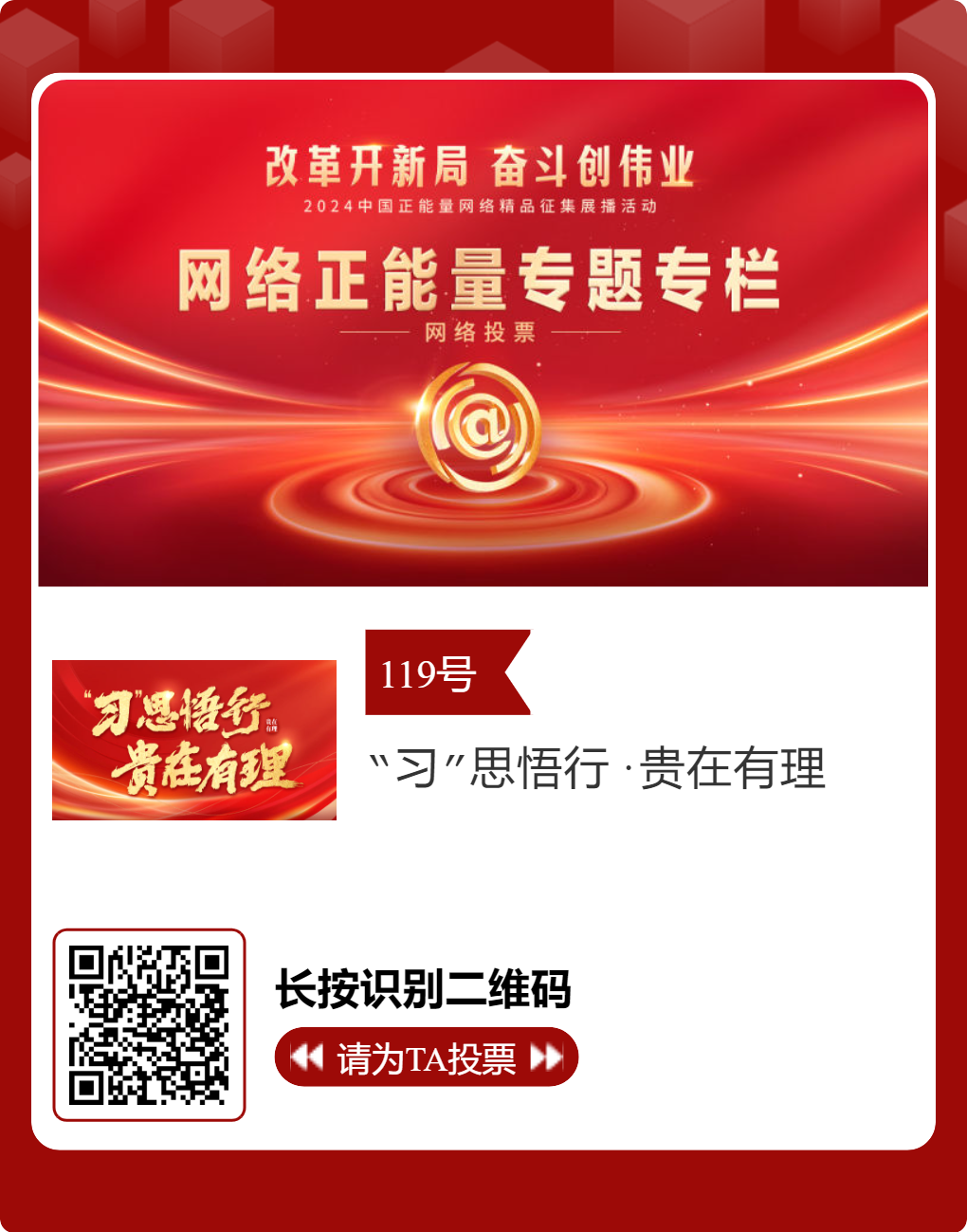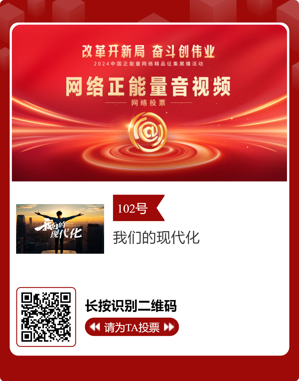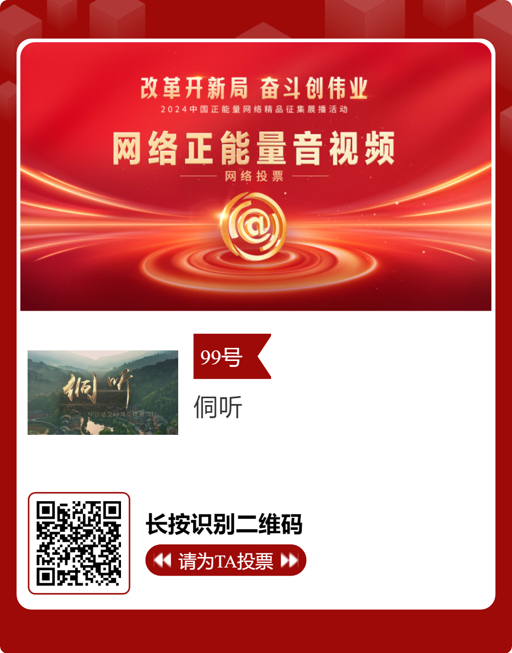贵州台12件作品入选!2024中国正能量网络精品,等你来投票 “网信中国”微信公众号 | 2025-02-16 14:02 改革开新局,奋斗创伟业。由中央网信办主办的2024中国正能量网络精品征集展播活动今天启动网络展播投票,时间为2月15日至2月21日,投票结果将作为中国正能量网络精品遴选的重要参考。中国正能量网络精品,期待每一个充满正能量的你投出点赞一票。 其中,贵州台12个作品入选。点击下方图片或扫描二维码进行投票↓↓ 记者: 周黔 编辑: 周黔 责编: 李佳 编审: 李铁流