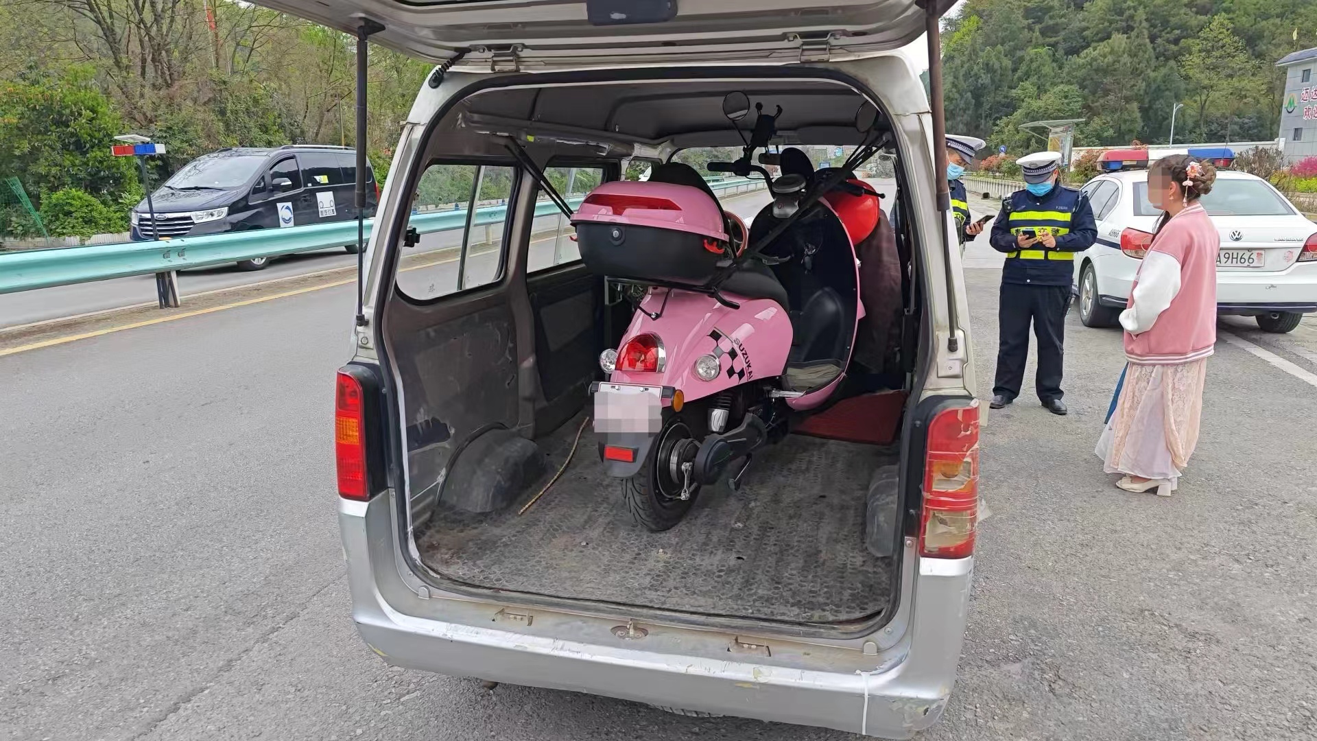 民警现场发现,该面包车后排座位全部被驾驶人徐某拆除,并拖了一台电动车。