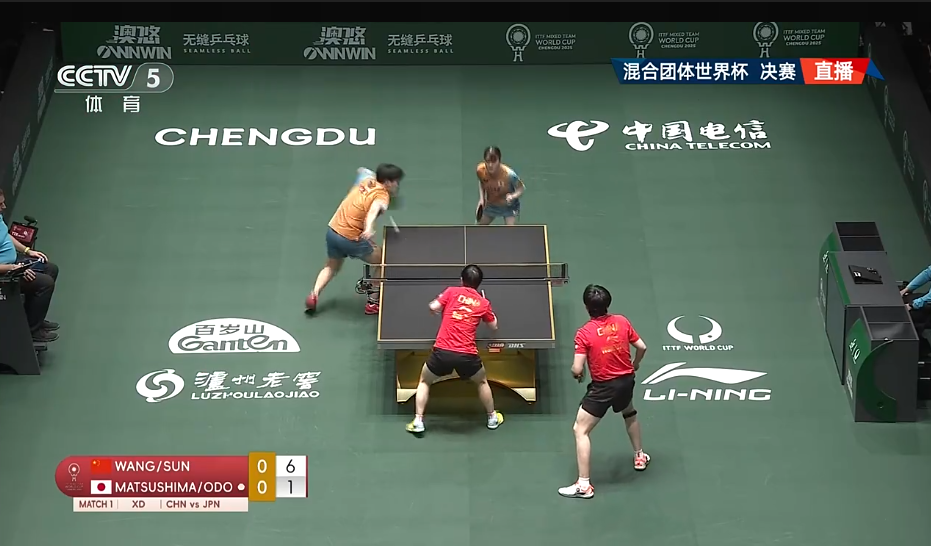首场混双比赛,王楚钦/孙颖莎3-0战胜松岛辉空/大藤沙月,三局比分为:11-4、11-4、11-6。中国队大比分3-0领先。