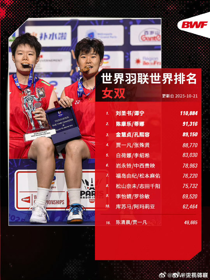 世界羽联最新世界排名揭晓 中国队包揽三项世界第一