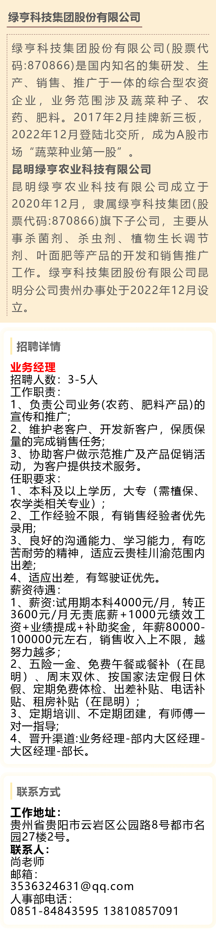 【上市企业】子公司贵州办事处招聘!年薪80000-100000元!