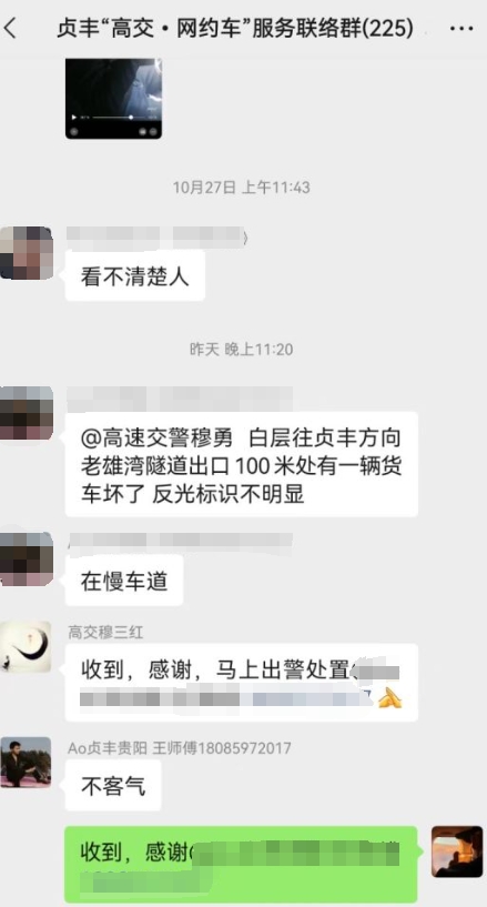 当晚23时许,一网约车驾驶人在黔西南公安高速交警组建的“高交·网约车”服务联络群内报警称:惠兴高速公路白层往贞丰方向老熊湾隧道出口100米处有一辆货车故障,车辆后方反光标识不明显,存在隐患,希望交警部门前往处置。