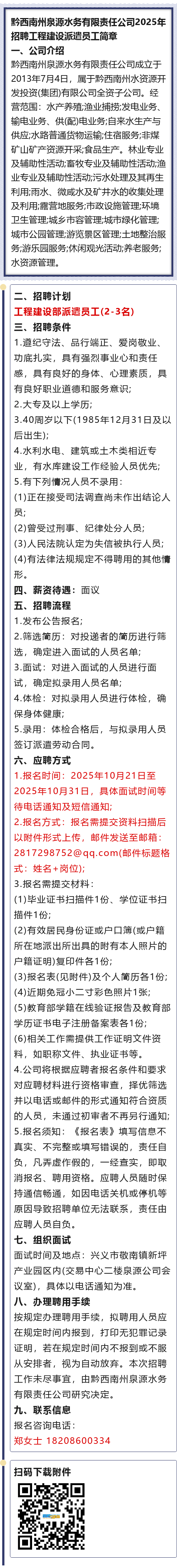 【国企】黔西南州泉源水务有限责任公司招聘!大专起报!