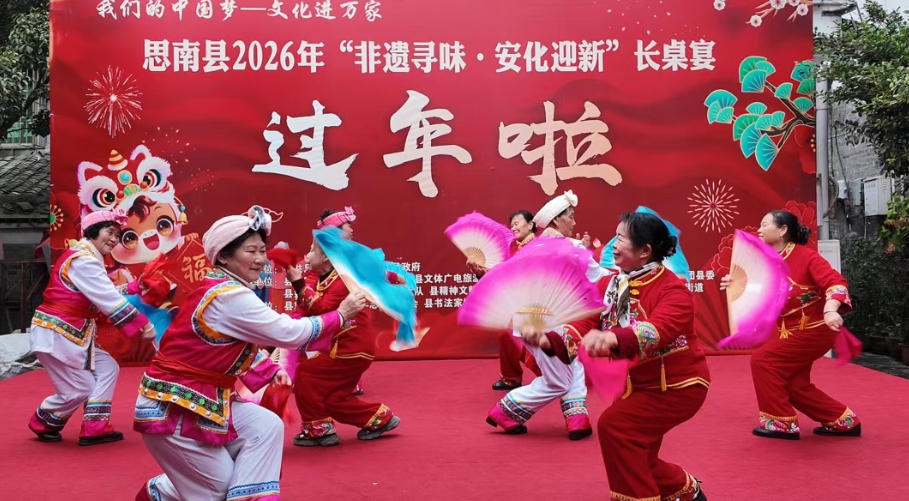 在县城安化古街“非遗寻味·安化迎新”长桌宴舞台上,着装整齐的花灯队员手持罗帕、彩扇,在音乐中翩翩起舞,每一次转身、每一次摆臂都引得现场观众连连叫好。