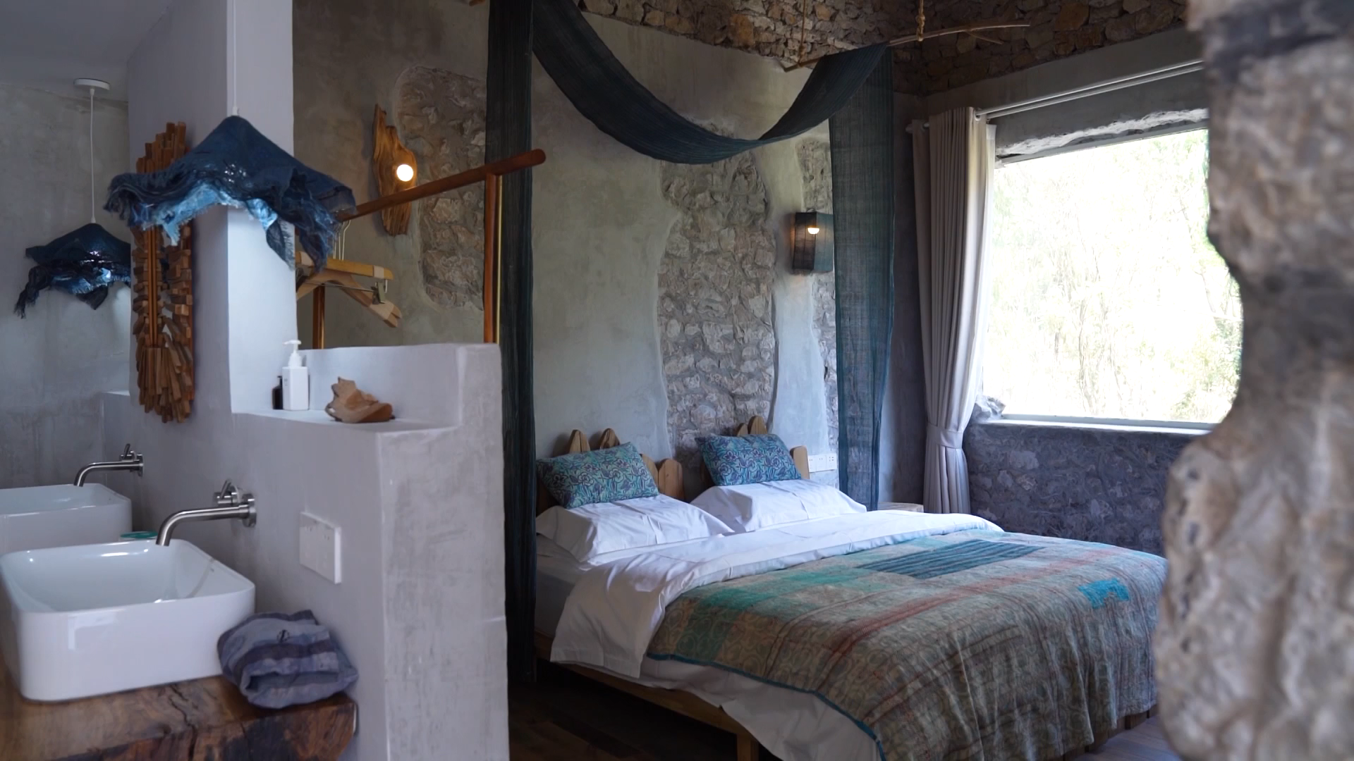 在这里,你可以体验原汁原味的田园生活。房间内的构造不同于寻常,磨平了墙体的棱角,流畅的线条,镂空的拱形门窗,米白的色调,满满的异域风情,让客人在房间内也能拍出美美的照片。