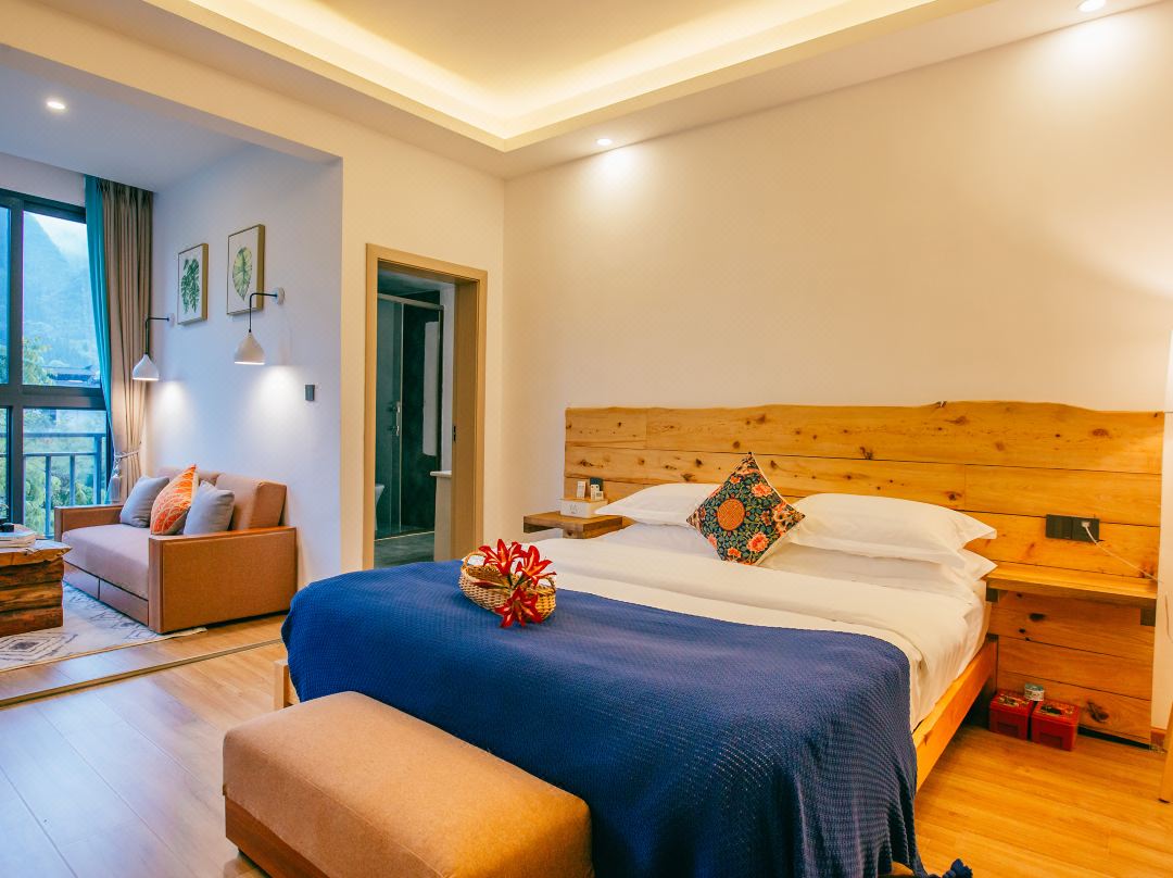 藏身于万福村半山的榕宿客栈,由四栋老屋改造。它忠于布依族传统,采用石木结构,让老屋的岁月感得以保留。这里没有突兀的设计,只有与稻田、峰林、古树的天作之合。室内空间更是一个小型民族艺术展,蜡染、苗绣等元素巧妙融入,文化韵味十足。