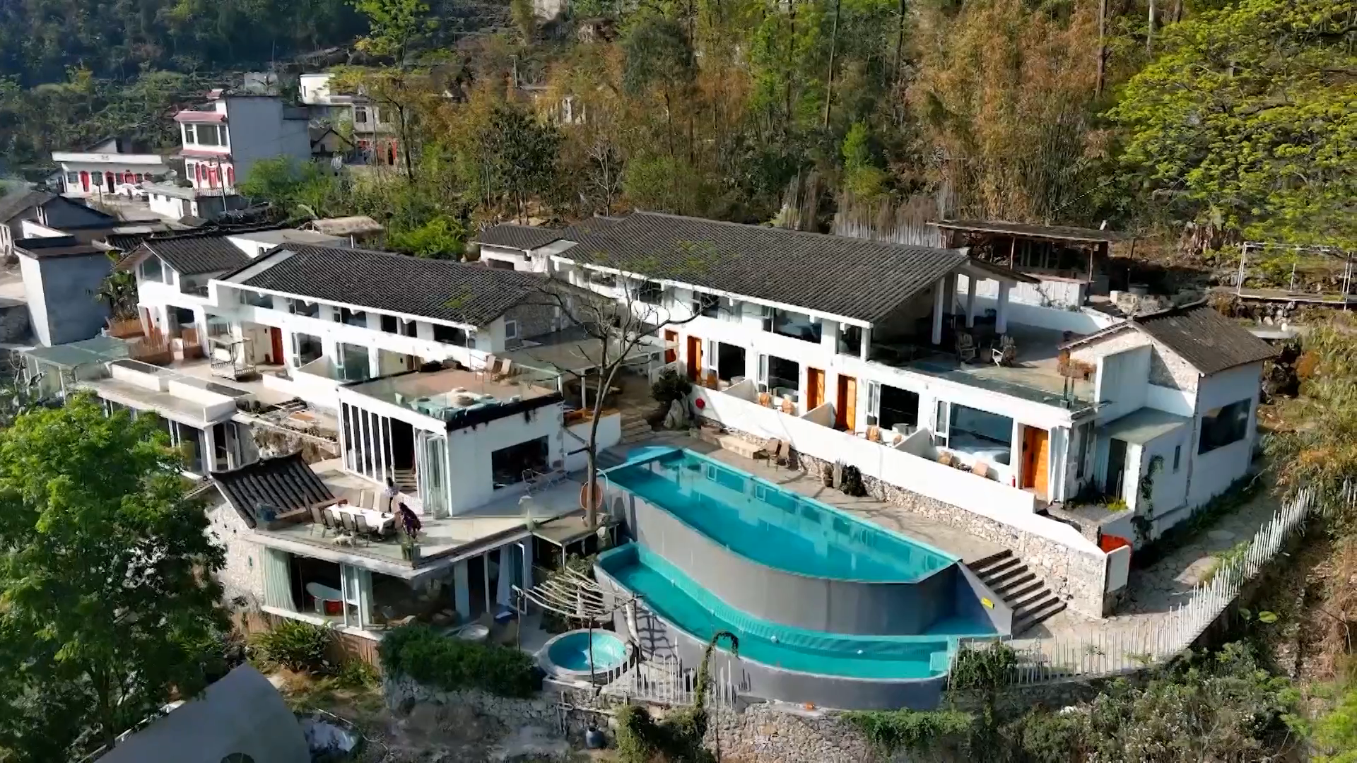 此外,民宿的用心随处可见:阳台外面有颗触手可及的超大柿子树;偌大的泳池成为了孩子们的嬉闹地;泳池旁的落地玻璃房、鹅卵石铺成的路......这里的一山一水,一草一木,一砖一瓦,都极大可能的保留最纯正自然的样子。