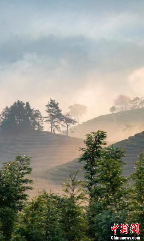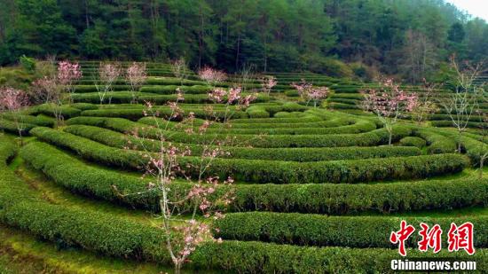 3月2日,福建武夷山国家公园春色迷人。步入春天,晨起雾气弥漫茶山,青色茶山、碧绿溪水、樱花盛开,装点武夷山国家公园春光如画。图为武夷山的青青茶园。