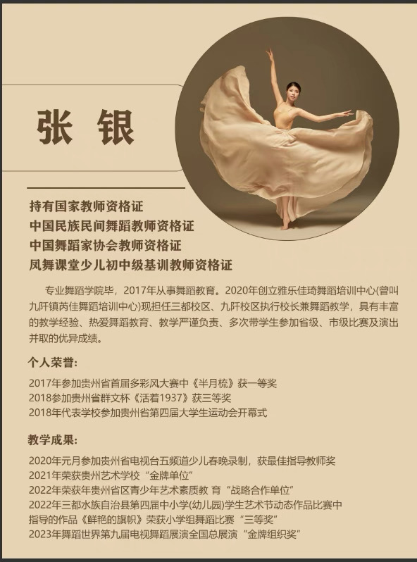 创始人张银老师专业舞蹈学院毕业,深耕舞蹈教育 7 年,始终秉承着“授人以艺、育人以德、塑人以美 ”的教育宗旨。张老师定期到省外学习深造,不断提升自我专业素养和更新 教学方式方法,多次荣获“优秀指导教师 ”等荣誉称号。