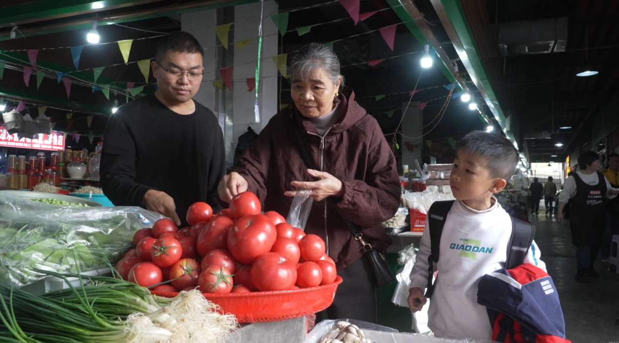 何佳恒的母亲(中)带着孙子(右)在市场买菜