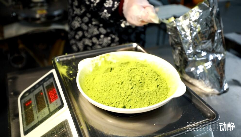 抹茶称量调配后,需将抹茶倒入到40度左右的铁锅中进行加热,直至清香飘出,才将抹茶与糯米、食用油混合搅拌。