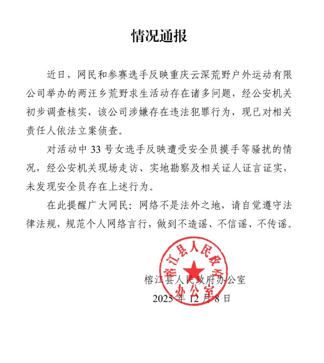 12月8日晚,榕江发布公众号发布榕江县两汪乡荒野求生赛事相关情况通报。
