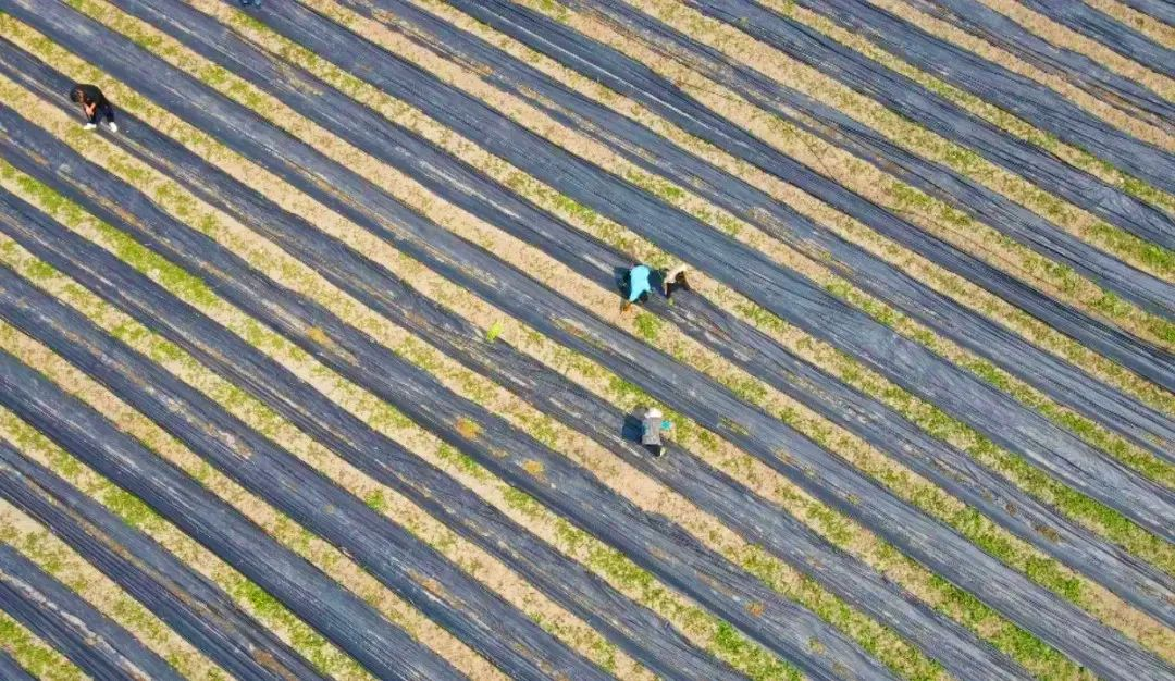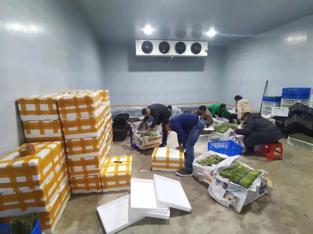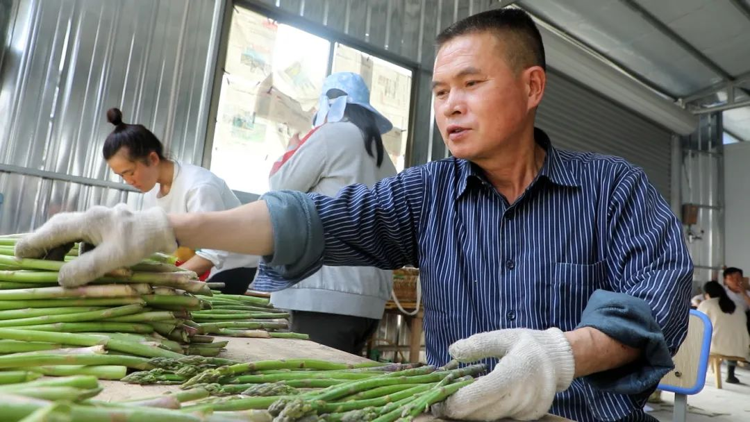 放眼望去,嫩绿的芦笋挺立在田间,微风拂过,芦笋飘香。村民们穿梭在芦笋种植基地,忙着采收成熟的芦笋,装框,打包,搬运……