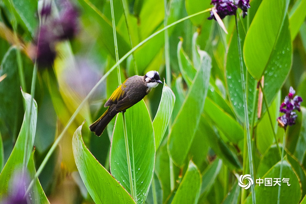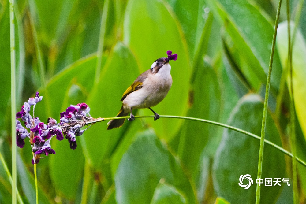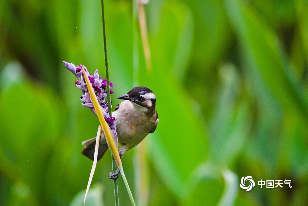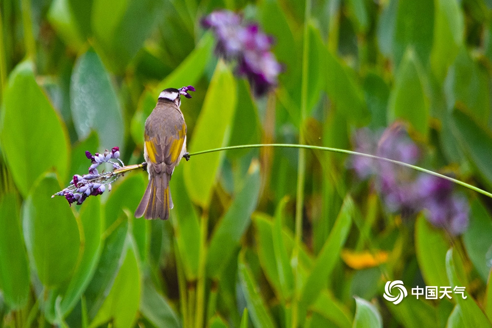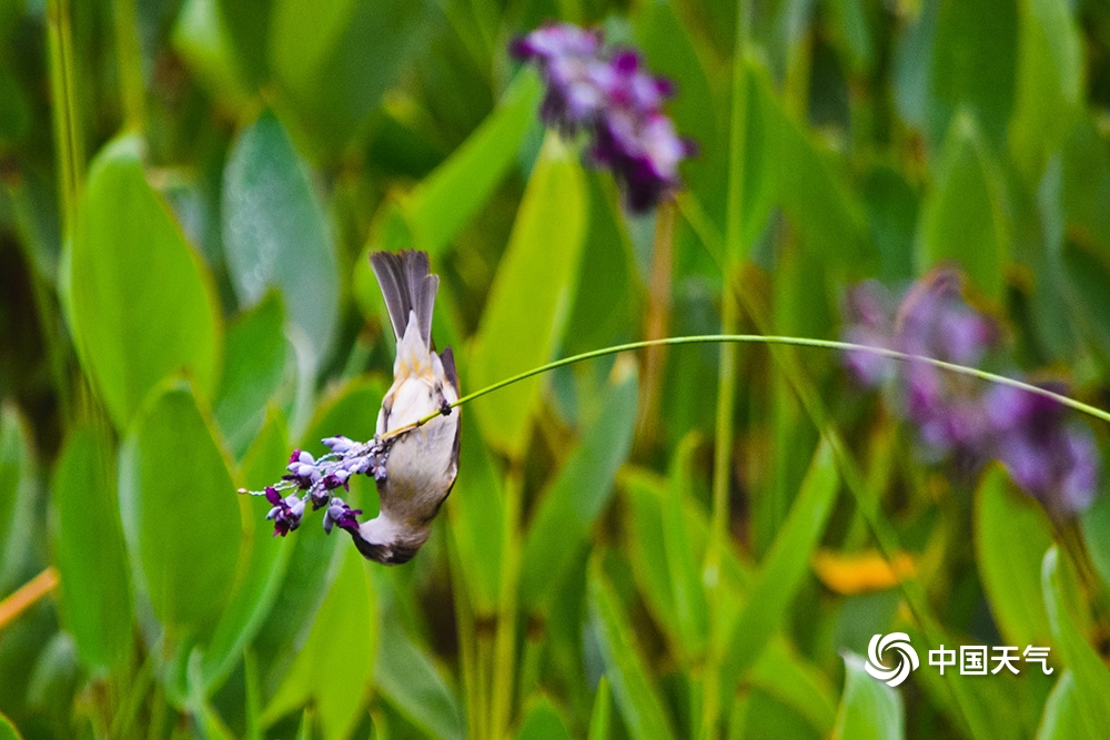 中国天气网讯 近日,在重庆彩云湖湿地公园,一簇簇紫色的再力花盛开格外惹眼,不少小鸟在花中流连,享受着“花朵大餐”。(图/曹凯)