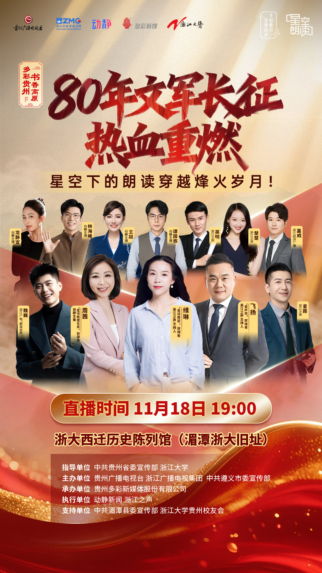 2025年是中国人民抗日战争暨世界反法西斯战争胜利80周年,为铭记“文军长征”光荣历史、传承伟大抗战精神,由中共贵州省委宣传部、浙江大学指导,贵州广播电视台、浙江广播电视集团、中共遵义市委宣传部主办,贵州多彩新媒体股份有限公司承办,中共湄潭县委宣传部、浙江大学贵州校友会支持的“多彩贵州·书香高原——‘文军长征 弦歌不辍’纪念浙江大学西迁办学《星空朗读》”活动,将于11月18日19:00在浙大西迁历史陈列馆(湄潭浙大旧址)重磅登场。