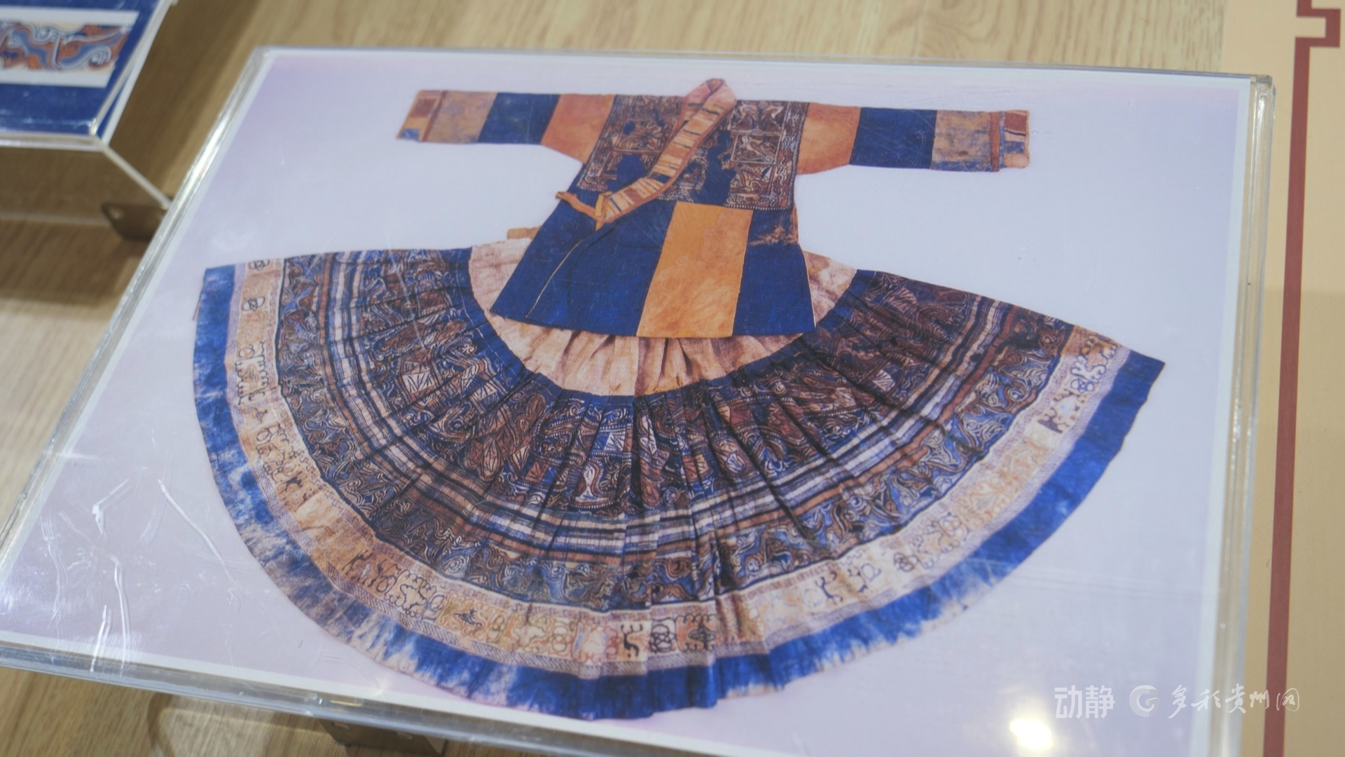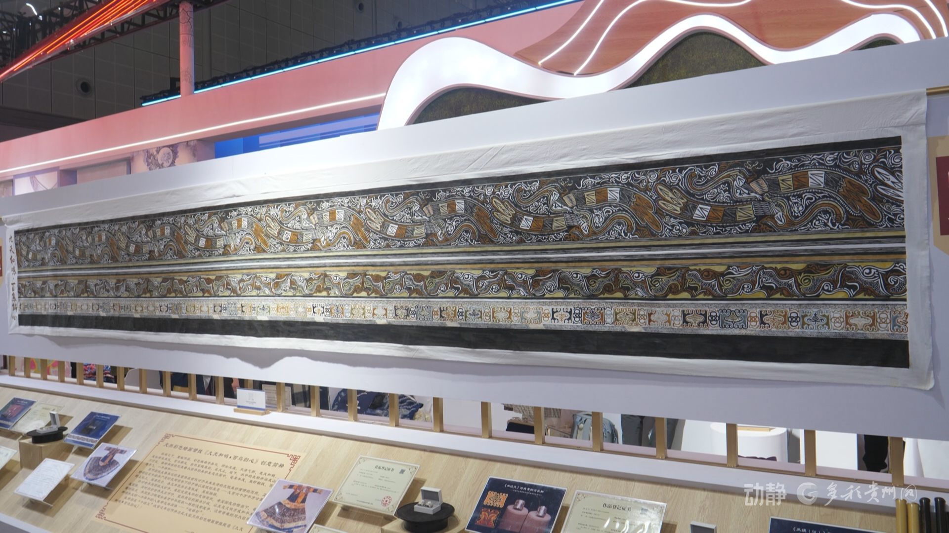 本届展会中,贵州展区首次亮相了一幅蜡画壁挂《九天和鸣·百鸟归心》,作品由织金县一对返乡农民夫妇耗时10个月手工绘制。这幅蜡画原纹样、原工艺复刻于国家一级文物宋代苗族鸟纹百褶裙,这条古裙是中国考古界首批彩染实物,承载深厚历史文化价值。