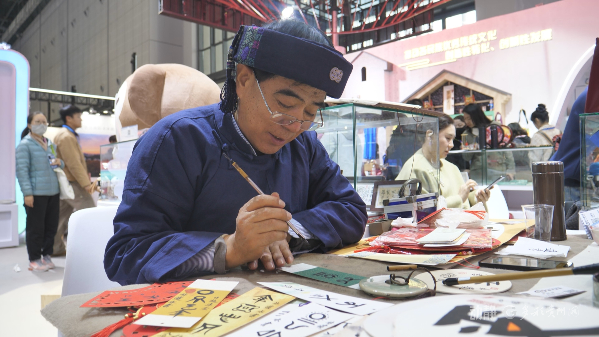 国家级非遗水书展区内,传承人向观众讲述老水书、水花钱等珍贵文物的独特故事,还现场为观众在文创周边书写水书祝福语,让“象形文字活化石”走出古籍文献,以可触摸、可拥有的形式贴近日常。