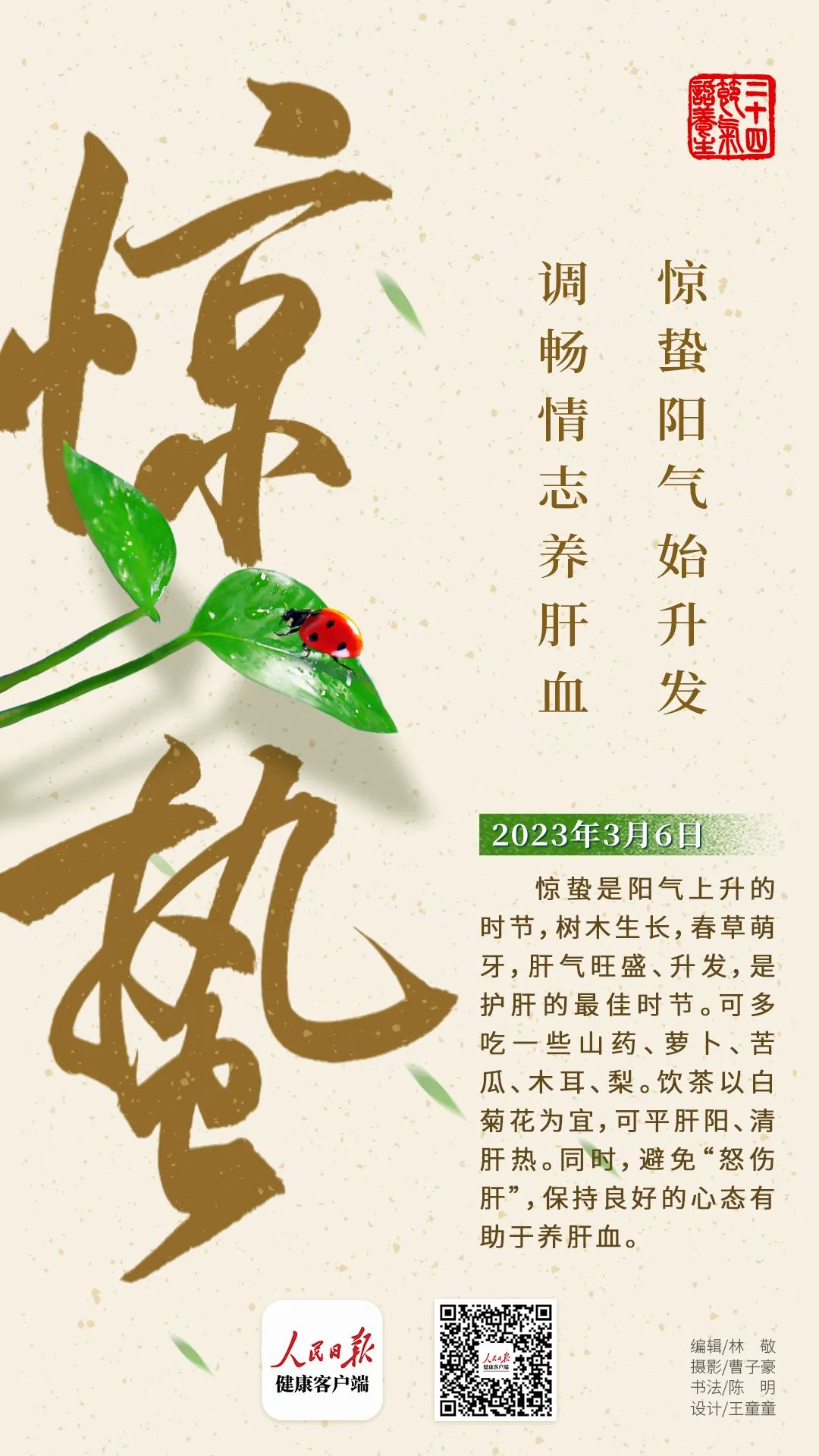 惊蛰过后需要调理脾胃、疏导肝气、养护肾水,南京市中西医结合医院脾胃病专家刘万里2011年在健康时报建议常做三种运动有益健康。⑤