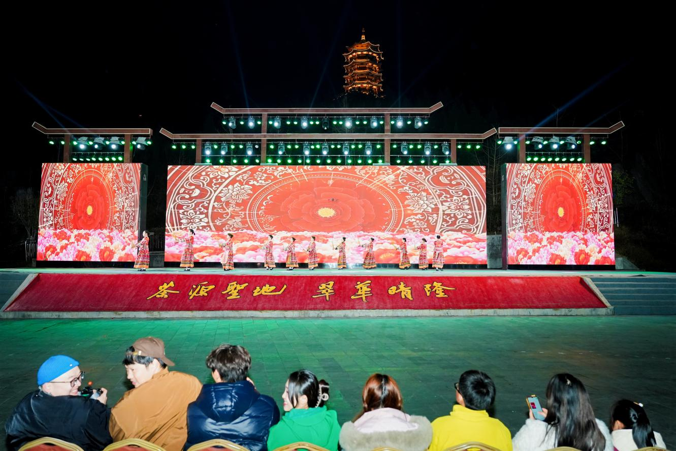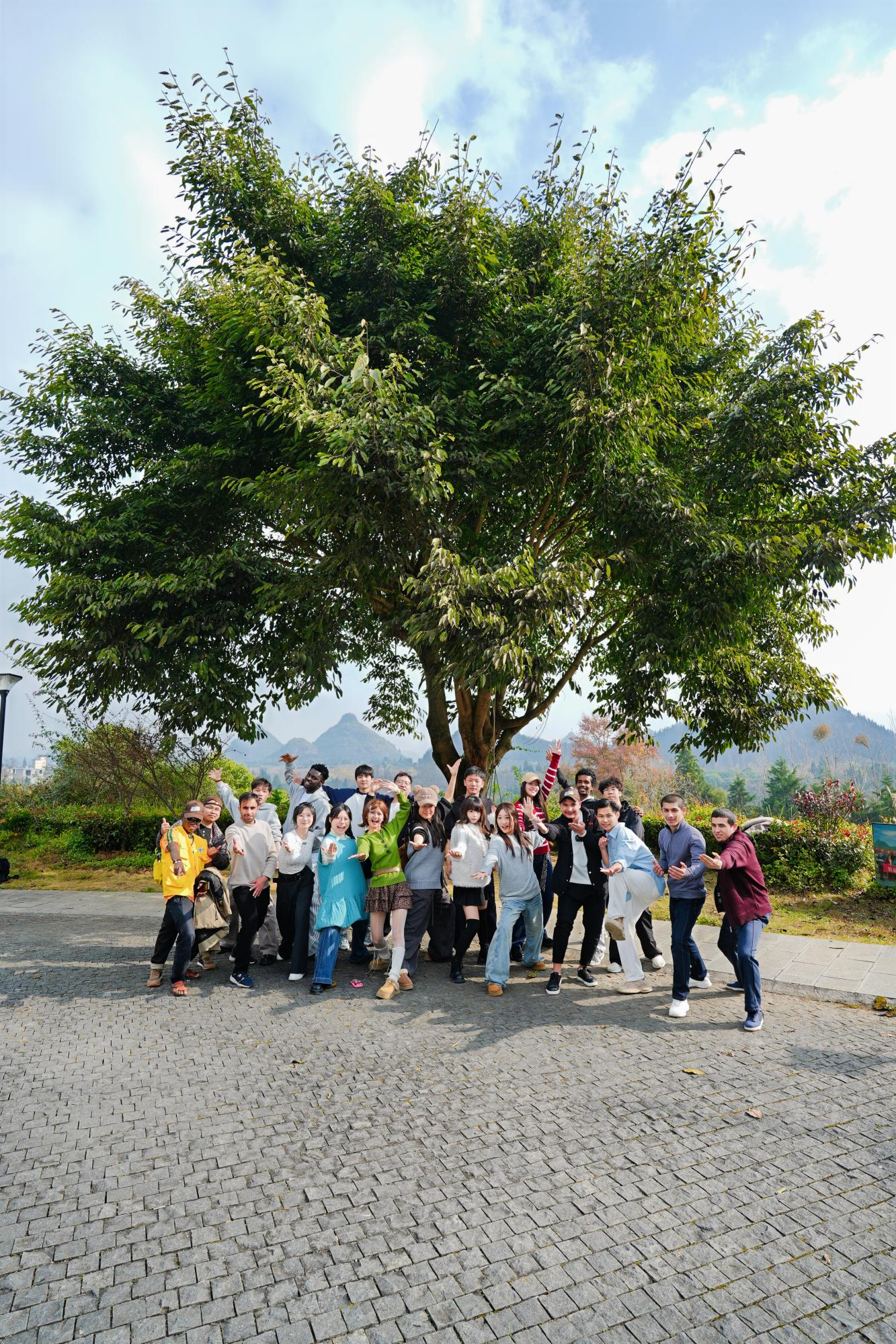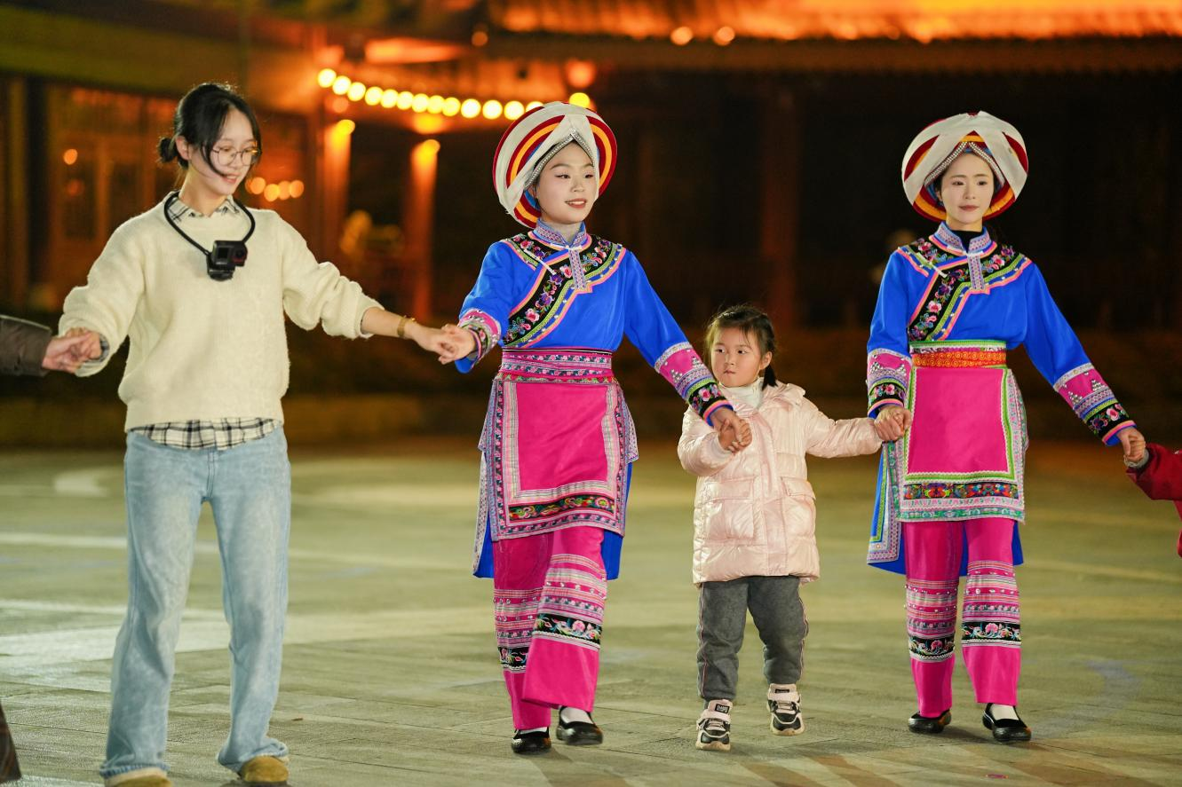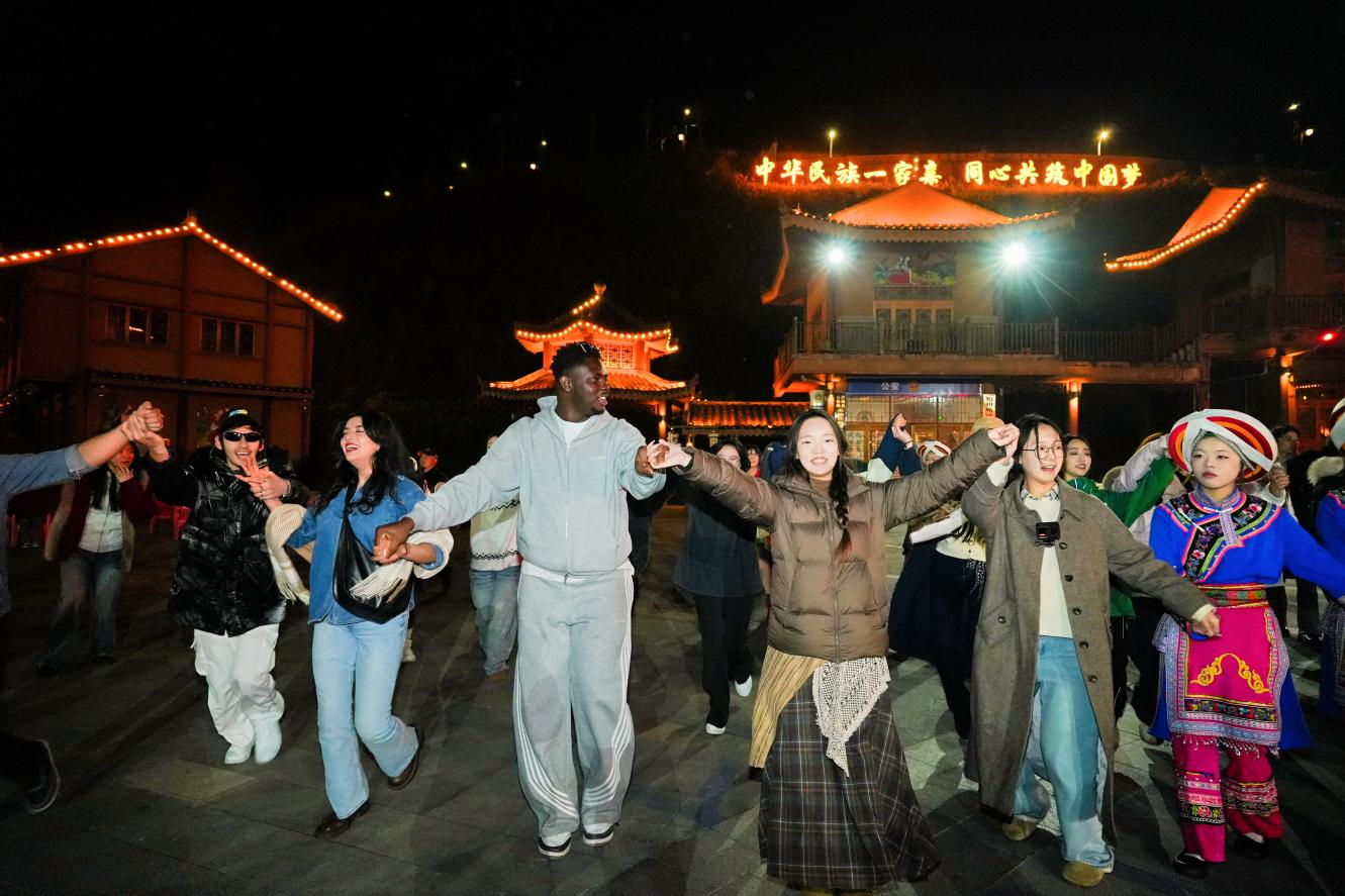 当夜幕降临,行程的节奏从白日的震撼观览转向夜晚的热情参与。学子们走进流光溢彩的阿妹戚托小镇,这里是易地扶贫搬迁后兴建的彝族特色小镇,充满了蓬勃的生命力。一场地道的彝族歌舞表演拉开了夜晚的序幕,随后学子们受邀加入热闹的“村舞”行列。在彝族同胞的带领下,大家手拉手,踏着被称为“东方踢踏舞”的阿妹戚托欢快节拍,尽情舞动。舞步铿锵,笑声朗朗,熊熊的篝火映照着中外学子无国界的笑脸。晚餐品尝当地特色美味,为这一天的奔波画上温暖而满足的句号。