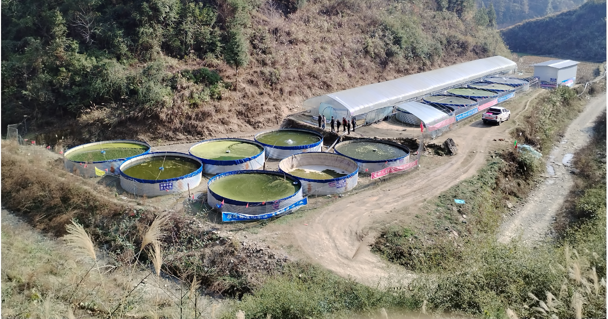 这个基地占地面积有10余亩,总投资170万余元。目前建有养殖大棚2个,建设7m直径,高1.5m,1.2㎜厚的镀锌板高位养殖池20个,配套建设初级尾水处理池400立方米;增氧系统4套、备用发电机组1套、视频监控1套;以及办公用房和配电房。现在鱼池里有小鱼苗约40万尾,涉及青鱼、草鱼和黄辣丁等7个品种,预计在2月底可全面上市,年产值100余万元。