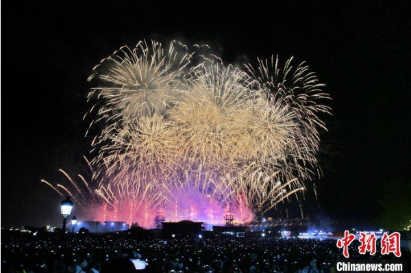 5月1日,市民和游客在天津泰达航母主题公园观看焰火秀。 中新社记者 佟郁 摄