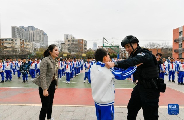 在天津市实验小学,天津市公安局和平分局特(巡)警支队民警现场指导小学生学习自我防护技能。