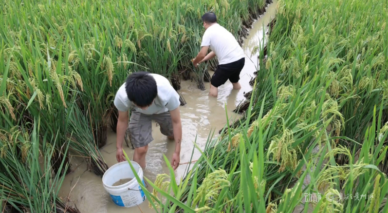 走进锦屏县敦寨镇亮司大坝,在种植大户龙安珍的稻田里,县农业农村局的工作人员正趁着晴好天气,忙着捕捞稻田鱼,为今年的稻田鱼测产做准备。