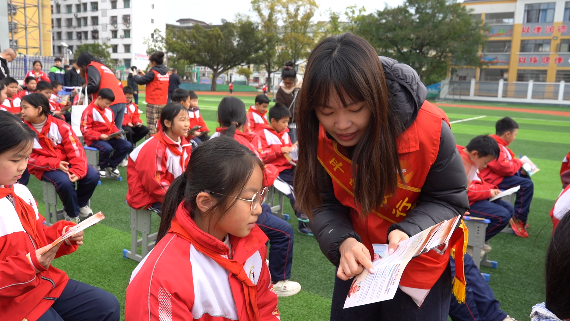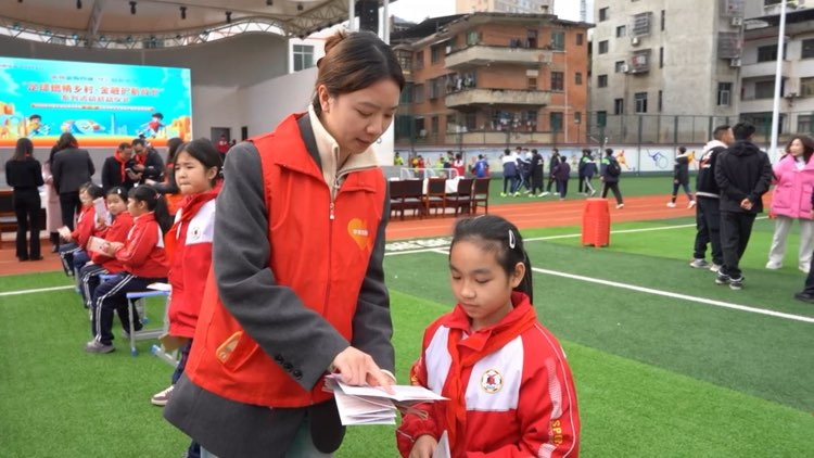 活动尾声,中国平安的志愿者们还为现场学生发放金融知识宣传折页,围绕折页内容开展趣味化的金融知识现场宣讲,引导孩子们将金融知识带回家,以 “小手牵大手”的形式,让金融安全知识走进家庭、辐射乡村,推动金融知识普及从校园延伸至千家万户。