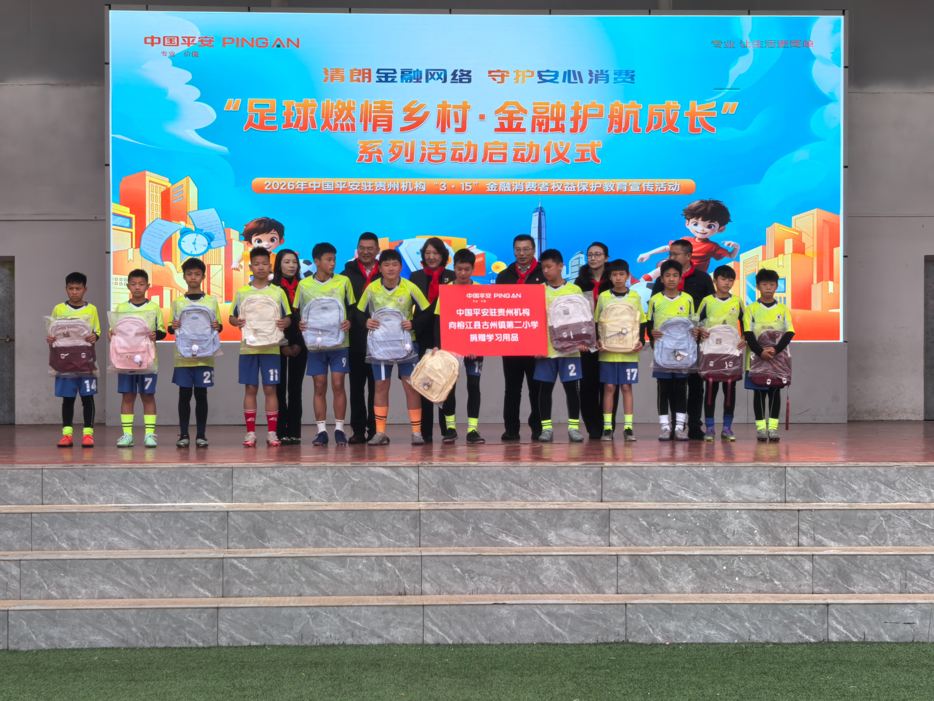 为深入贯彻金融为民理念,扎实推进金融知识进乡村、进校园、进重点人群,依托3·15国际消费者权益日契机,2026年3月10日,平安集团驻贵州地区统管党委、中国平安贵州地区消保联席、平安银行贵阳分行、平安产险贵州分公司、平安人寿贵州分公司联合榕江县人民政府,在榕江县古州镇第二小学举办“足球燃情乡村・金融护航成长”3・15 金融知识进校园活动,并正式启动2026年平安集团在榕江“足球+金融+公益+乡村振兴”全系列活动,以多元举措践行企业社会责任,为乡村振兴注入金融与公益力量。