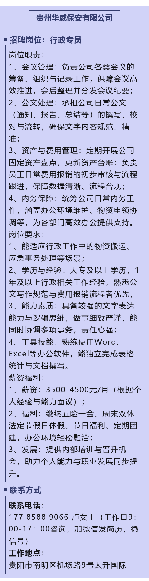 贵阳市南明区招聘行政专员!五险一金、周末双休!大专起报!