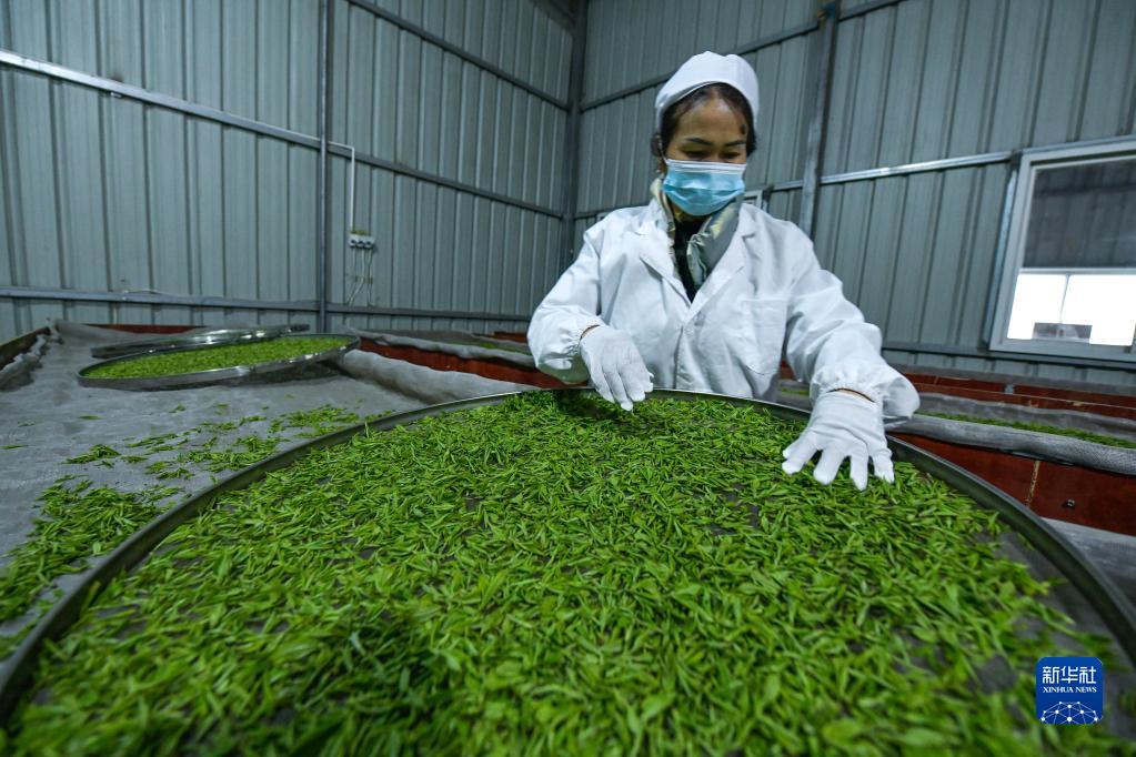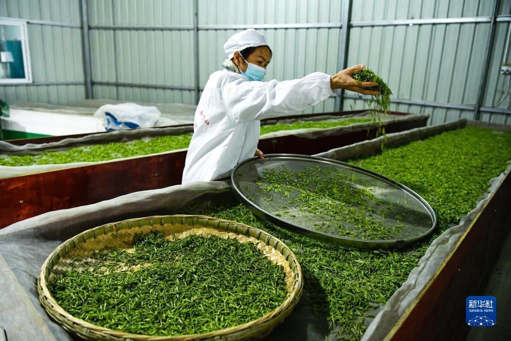 2月23日,贵州省普安县茶源街道一家茶产业合作社的工人在摊晾茶青。新华社记者 杨文斌 摄