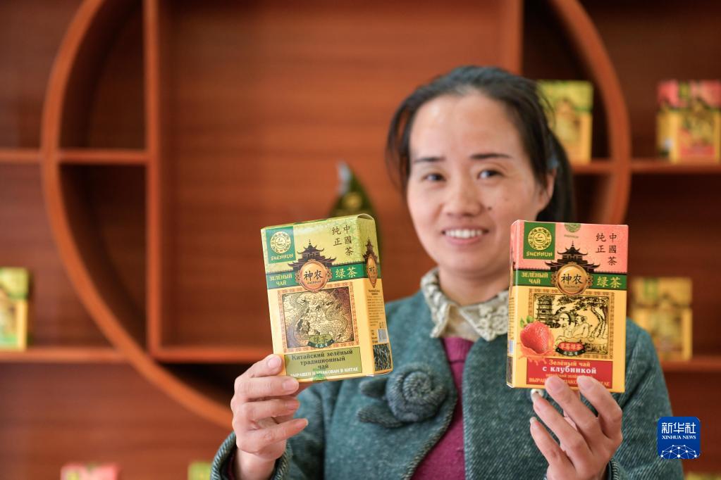 2月22日,贵州省普安县茶源街道一家茶企的工人在展示出口俄罗斯的茶叶包装。新华社记者 杨文斌 摄