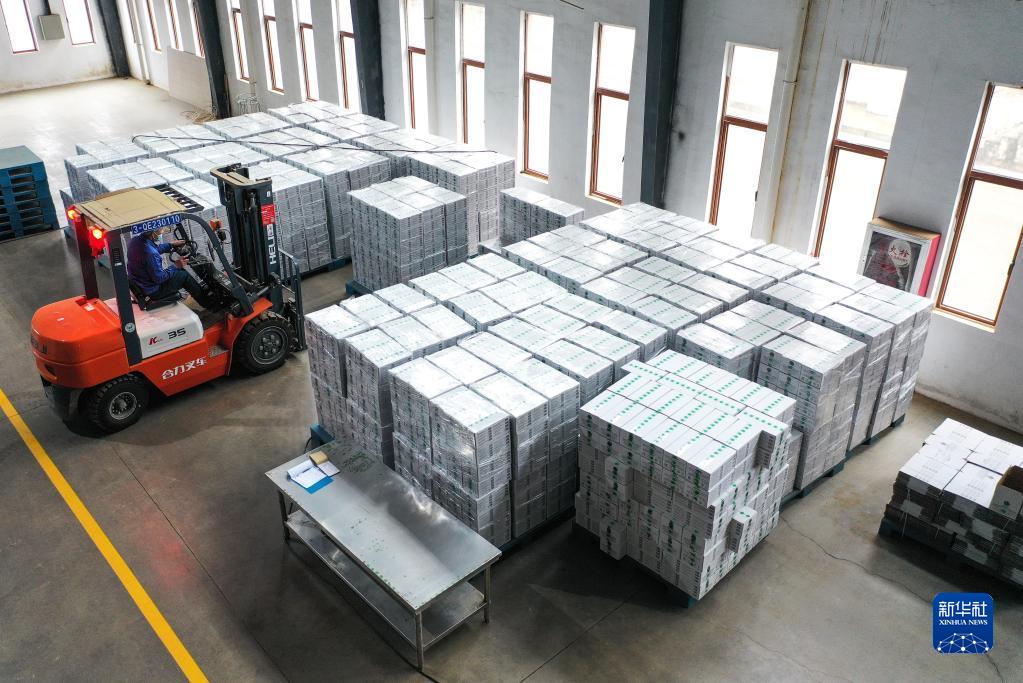2月22日,贵州省普安县茶源街道一家茶企的工人在搬运将出口俄罗斯的茶叶(无人机照片)。新华社记者 杨文斌 摄