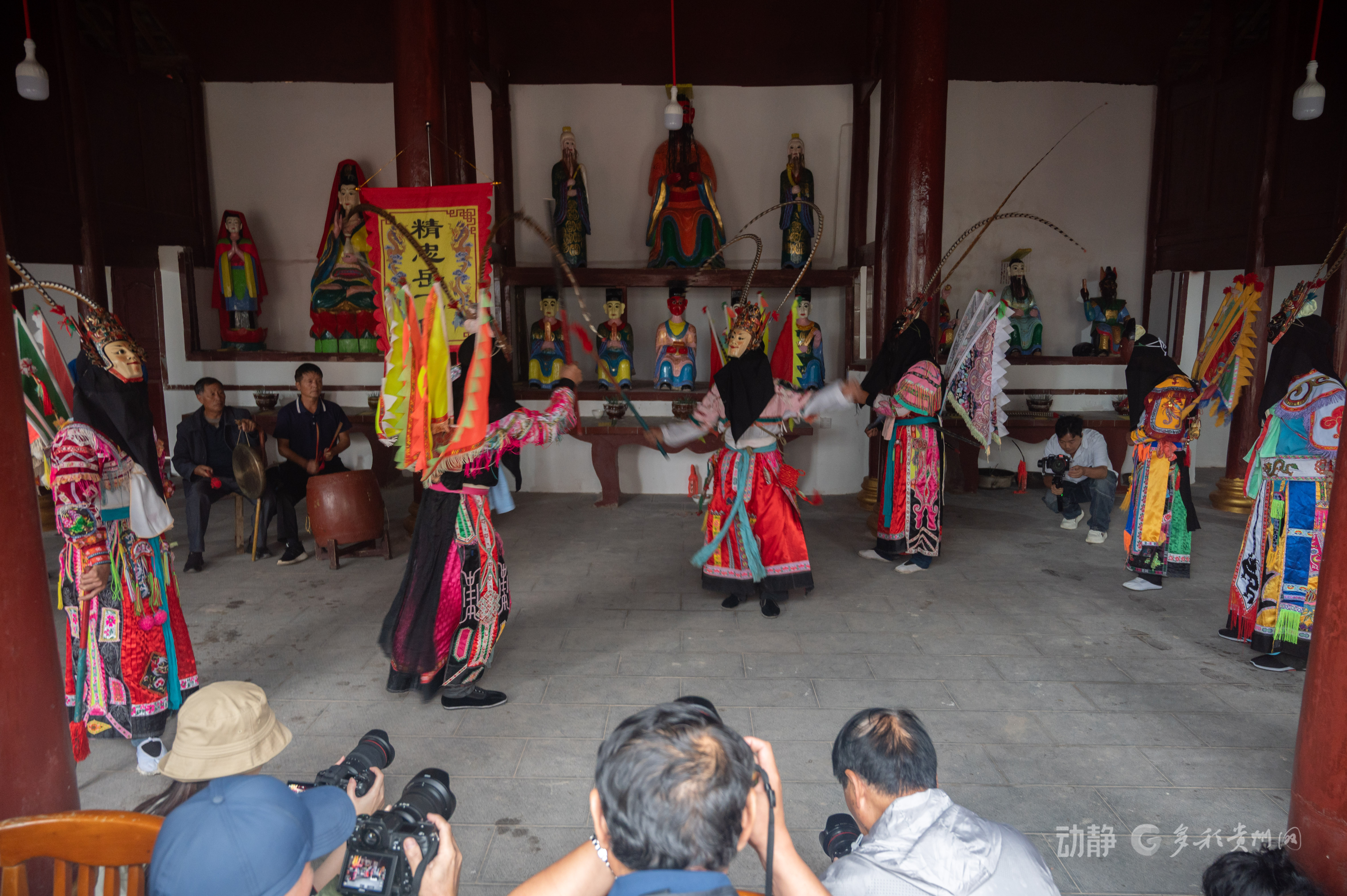 8月22日,2025多彩贵州·第十八届中国原生态国际摄影大展“访秋”主题采风团走进安顺市西秀区旧州镇詹家屯村。来自印度尼西亚以及中国贵州省、江西省、广东省的摄影师实地探访安顺地戏,通过近距离观摩了解其表演形式与文化内涵。作为国家级非物质文化遗产,安顺地戏凭借独特的历史传承和艺术魅力,吸引了中外摄影师的关注。