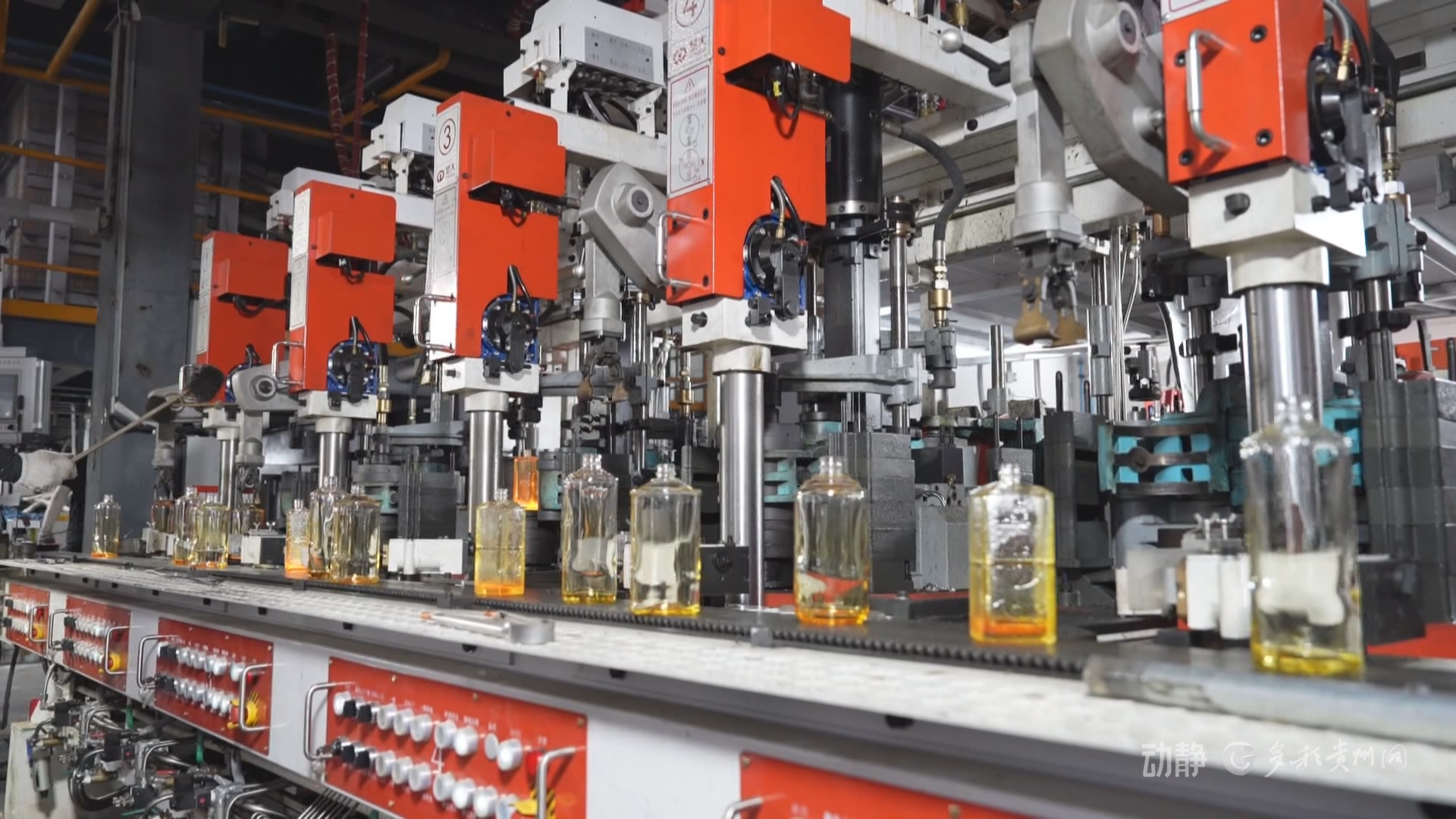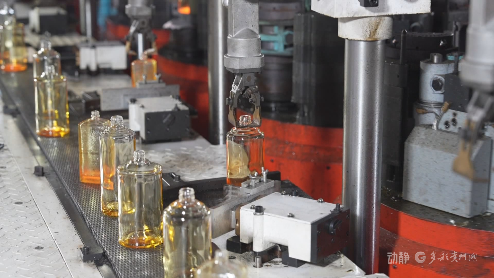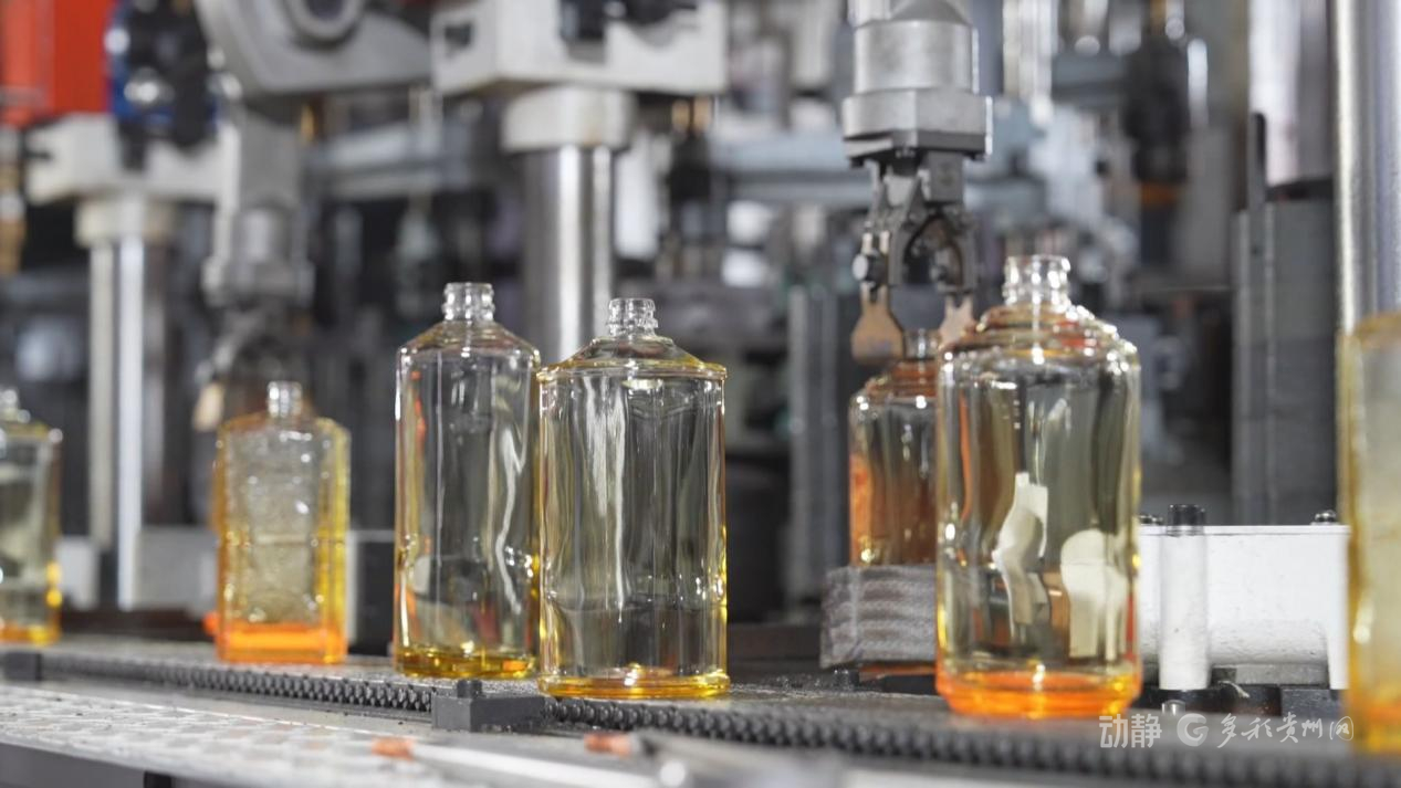在贵州华富天玻璃包装有限公司制瓶车间内,炉火通红,智能化生产线高速运转,机械手精准抓取、塑形、打磨,玻璃瓶有序下线。