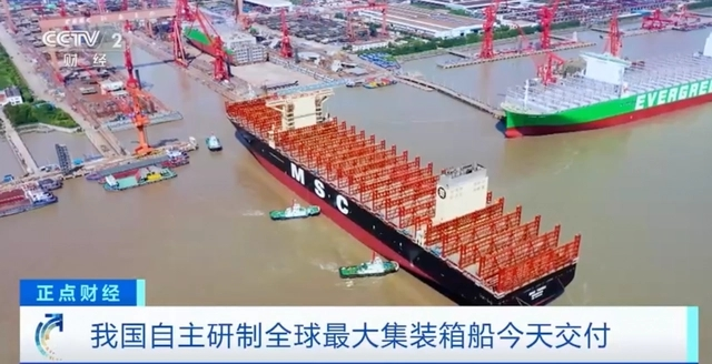 ▲2023年3月9日,我国自主研制的全球最大的超大型集装箱船“地中海泰莎”号在中国船舶集团沪东中华造船厂交付,甲板面积近似于4个标准足球场,可以承载24万多吨的货物,全年可以减少6000吨左右碳排放。