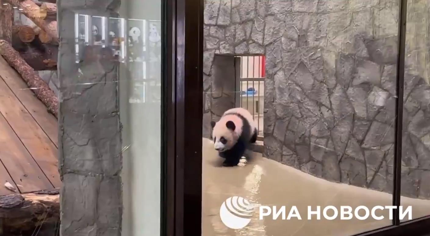 ▲大熊猫“喀秋莎”与俄罗斯游客见面