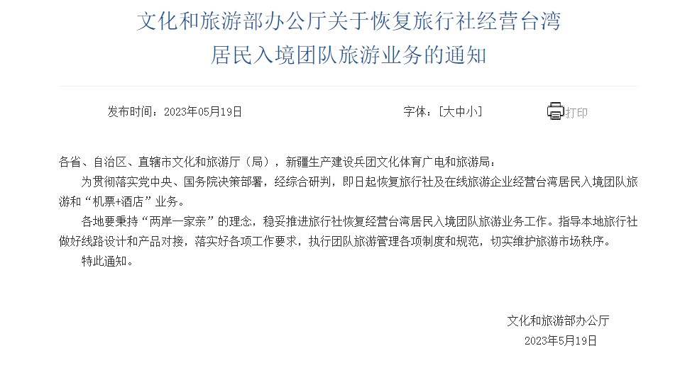 文旅部19日发布关于恢复旅行社经营台湾居民入境团队旅游业务的通知。